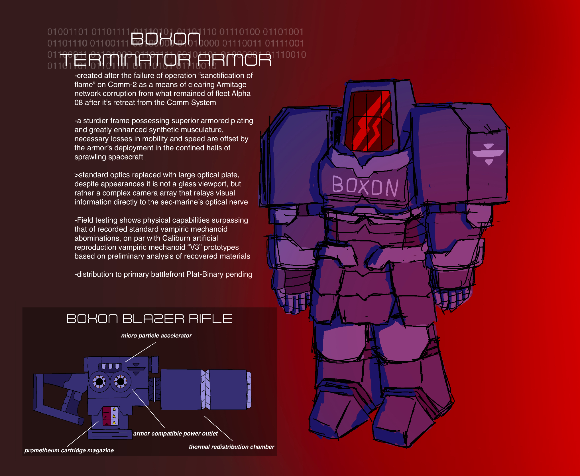 >>216441 They’re the same sec-marines underneath, it’s just that the armor contains much more solid structure, regular sec-marines have a layer of flexible artificial muscle fiber consisting of electrogravidic-ferropolymer actuation cord and polymetal rubber, Terminator armor consists of a much thicker and denser artificial muscle fiber layer further enhanced with a ceramite exoskeleton reinforced with adamantium splints, the extremities of the hands/feet are mechanical, with the actual hands/feet being housed inside the arms/legs