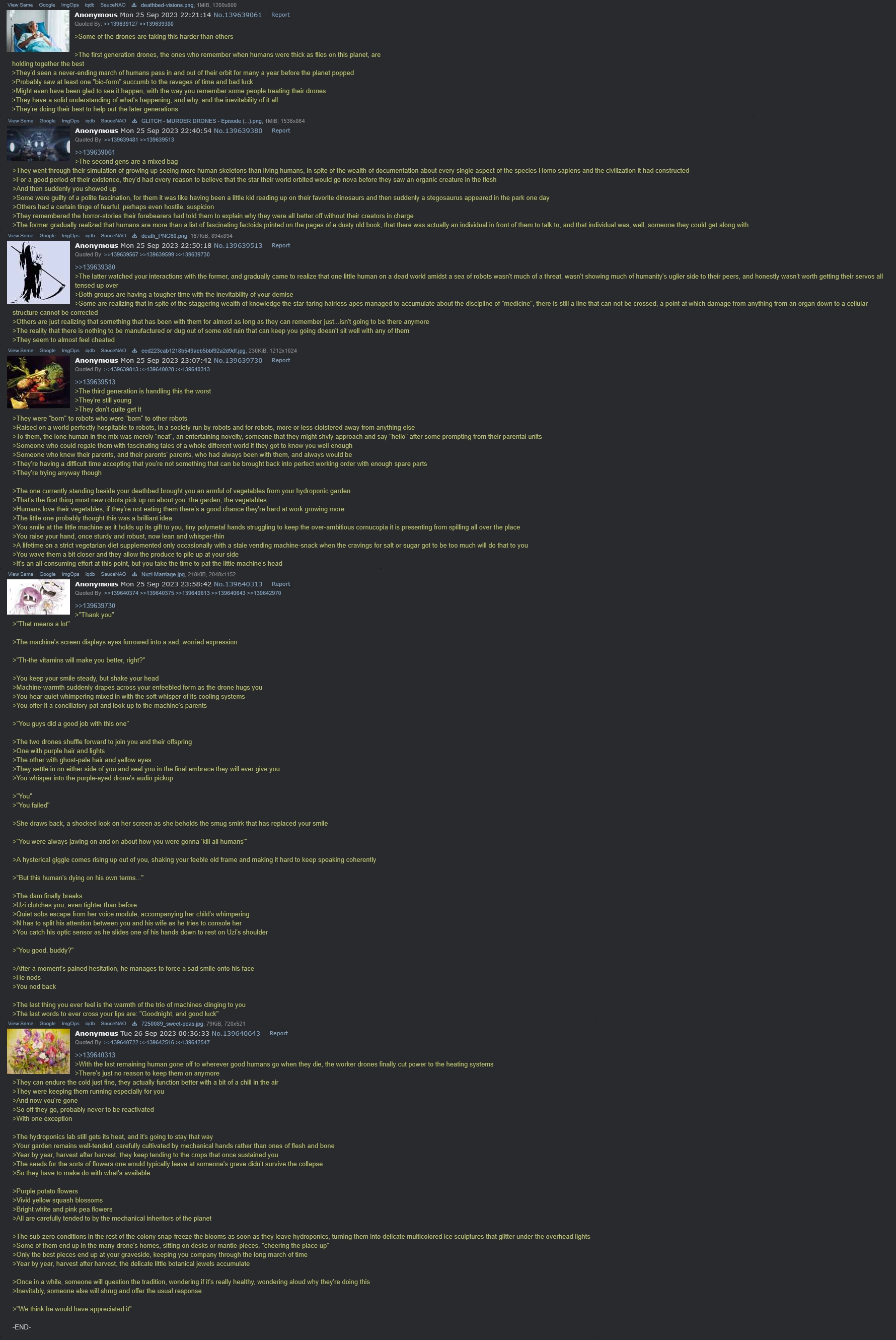 >>219475 >>219476 >>219477 >>219484 >>219485 >>219486 >>219488 I decided to post it myself since they seemed to be in a crummy mood. Although I'm rather curious as to why it stops being a greentext and just a text at some point