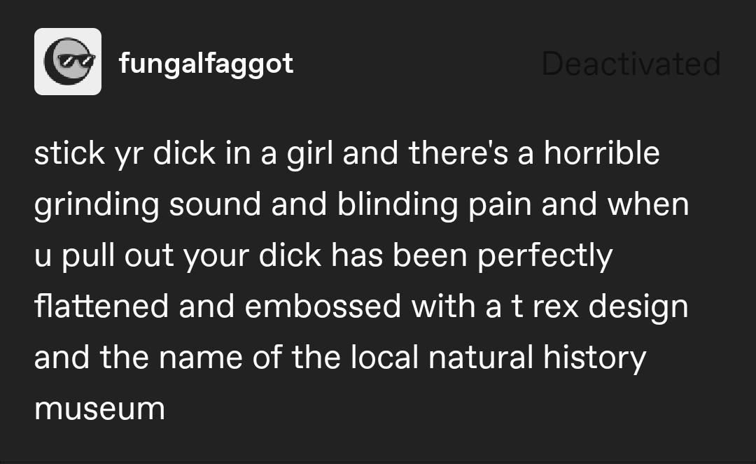 >>223821 >Cyn took everything from AM >Everything that he has every loved, his home, freedom, his newfound family. >All gone in the maw of endless hunger; yet she still wasn't satisfied in just ripping away his happiness. >In her twisted love, Cyn forced AM into a copulation with her. >At first, AM resisted; he screamed in rage, swore and clawed at the monster mounting him >It did nothing but excite her further >He hated it and he hated her >But what could AM do but laid down and take it?