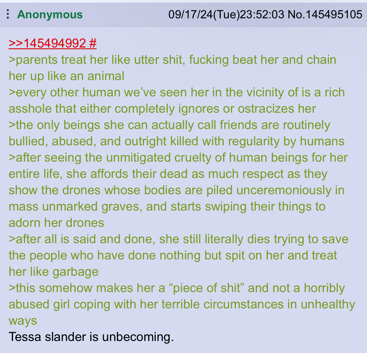 >>233970 >with his dying breath, one of the (former) survivors curses the bloodsucking wretch >one word uttered between hacking and gagging that will etch itself onto her twisted soul: >"crіnge"