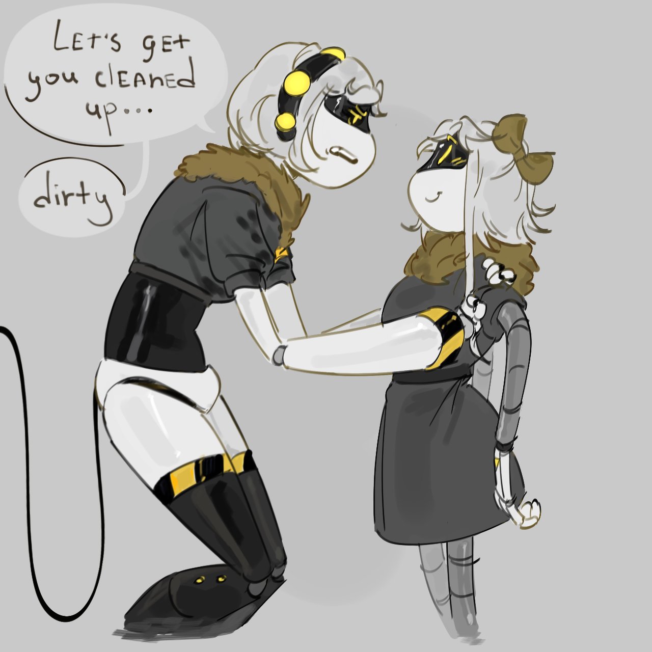 >Be you, Anon >Human born, frozen in cryo, and then thawed and raised in outpost 3 alongside Doll as your sister >According to your adoptive parents the bunker wanted you dead for being human but grew to not hate you, you're tolerated by them >You stuck by Doll after the death of your adoptive parents, even when Doll started her new diet of long oil >She was all you had >She's your only friend >Lizzy doesn't count, and if anything she uses you like a verbal punching bag always giving backhanded complements >Thad doesn't count, he's a friend to everyone in the bunker. And Doll says that a friend to everyone is a friend to no one. >Rachel is a slut, Emily is too scared of you to even look you in the eyes, and you're not going near that living fire hazard >The only drone in the bunker to truly hate you is Uzi >Ever since day one of meeting her she hated your guts >Constantly making threats, making vaguely veiled insults at you, drawing you dead in various ways and constantly reminding you about how you'll eventually starve to death >Joke's on her, Doll can somehow find food for you without a problem >So imagine your surprise when you find her notebook and take a look through it and find dozens upon dozens of shitty anime-esque drawings of you and her kissing and fucking