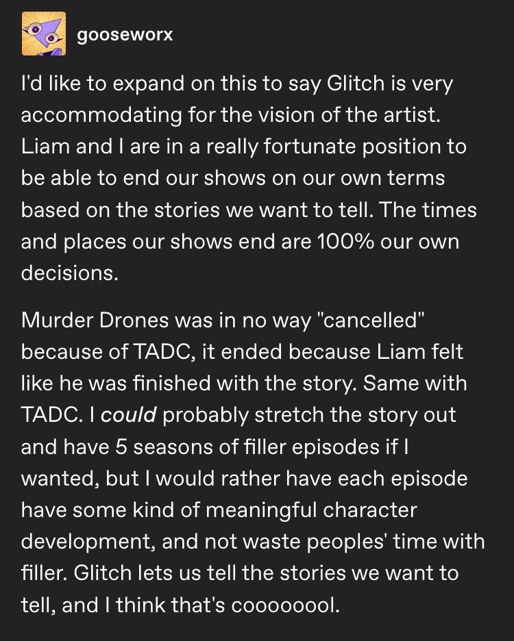 >>25358 >Liam wants to wrap things up in 1 season but Glitch needs money >Liam is willing to negotiate >Glitch takes an immense financial risk in letting Liam completely switch gears at the very last second to focus on the universe instead of grating slice of life lore bait with all the cool stuff just implied in the background >TADC is a windfall >Liam now gets to finish the story in 1 season at an even higher quality than could have ever been reasonably expected previously This is the best of all possible outcomes for the series finale's quality, don't take it for granted.