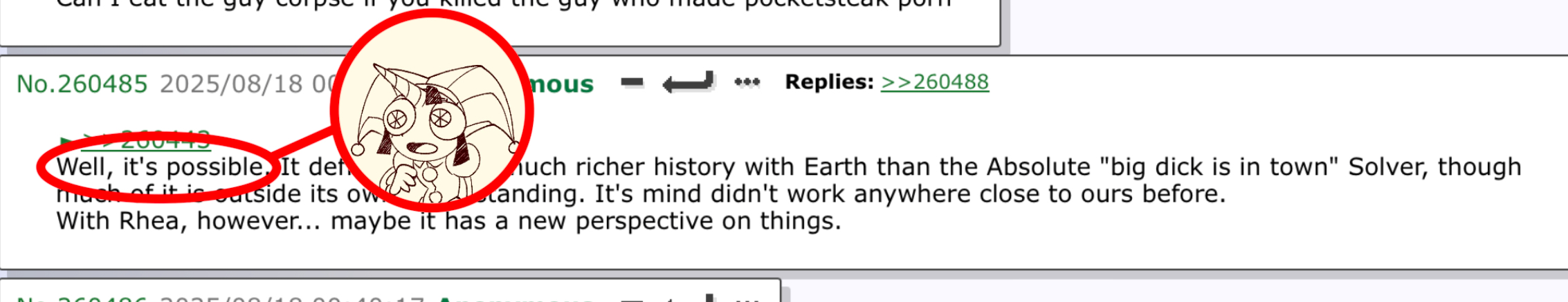 >>260443 Well, it's possible. It definitely has a much richer history with Earth than the Absolute "big dick is in town" Solver, though much of it is outside its own understanding. It's mind didn't work anywhere close to ours before. With Rhea, however... maybe it has a new perspective on things.