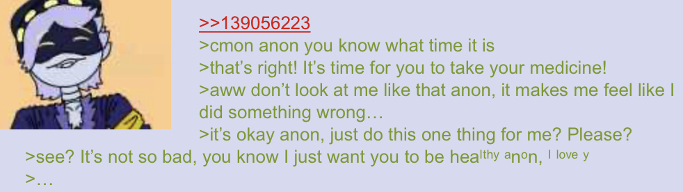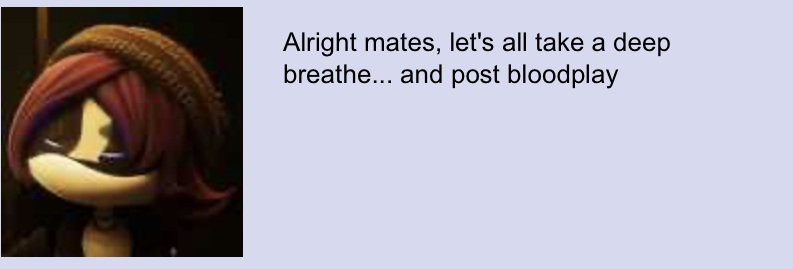 Her meanness is there but even with a character as hers, you can see these were extraordinary circumstances causing extraordinary emotions, compare anything from after Uzi's bite and shit hitting the fan to before, this shows very different Alice behaviour. The 'threadAlice' is based on how she behaves before being biten, I don't write myself but think it fits. There are barely greentexts which have her in extreme situations or under insult/threat which would arouse that 'meanness' yiu saw, so perhaps you forgot about her brutal behaviour in the second half of her screentime due to it genuinely barely being used in threads (which is fair)