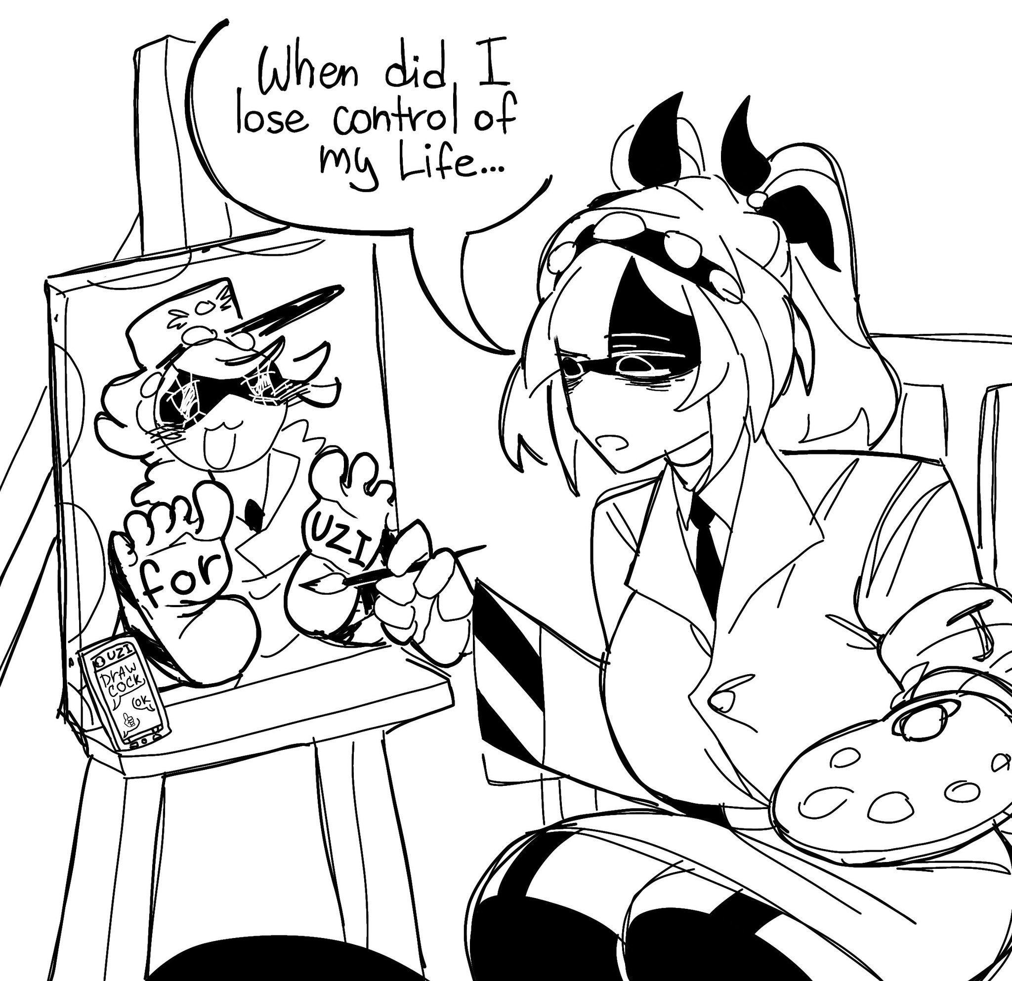>He looked at his plate, it was something weird, he saw something similar in a book once, pasta, but this one was maybe translucent, it was hard to tell, it had a thick black sauce >"You do not need to worry, the dinner is edible for drones, eat as much as you please" Hearing this he waited for her to eat first >Beelzebub put a napkin around her neck, and another on her legs, and seeing how he was not eating out of fear, she decided to eat first >Picking up a fork and taking some of the 'pasta' she was ready to eat, but it looked like she started to salivate uncontrollably, a bright yellow substance, so uncontrollable to the point some of her drool dripped onto the napkin >She took a bite, and she smiled when she swallowed "I know I'm the host, but I must say, this is delicious" The drone didn't understand why her saliva looked like that, maybe she had some mechanical failures >But now a little more confident he took the fork and took a bite of the pasta "And how is it?" Asked Beelzebub "It's... Really good" It took the drone by surprise but it was really good >He felt more relaxed knowing that the thing he was eating was not going to kill him, but he still had some questions