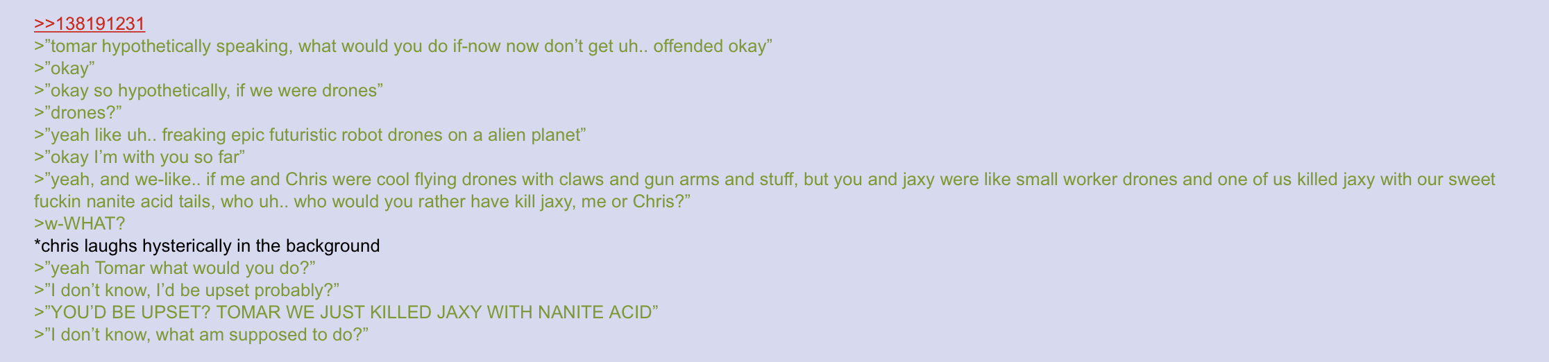 >Post-good ending >Stepdad anon never adopted Tessa but had a kid of his own >You >There's a knock on your door >You look through the door peephole because you know better than to make your presence known >You see nobody >You open the door >You know better than to let burglars think that the house is uninhabited >There's a drone in your doorstep that you almost drive your knee into >It is a lady drone. A sexeh lady drone... >With a sword! >The drone starts reading from a piece of paper >She tries to remain professional but she is barely holding it together. She is clutching the paper and holding back tears while her voice is having a hard time staying even >"D-Dear sir or madam..." >"SIR!" >"My name is Serial Designation J. I am here to-to inform you that you are the sole inheritor of the Elliott estate and fortune." >The drone starts twitching >"For years now. Because as it turns out; Tessa was dead all along and *I* killed her." >The sword falls for her limp grip with a clang to the floor >The drone needs both hands to hold her face >She makes muffled crying sounds while shaking >"Eeeee heeeeee!...I killed my Tessa....." >The drone cries and cries, making this awkward >Do you close the door to give her privacy? Do you wait for her to finish her piece? >You resolve to remain indecisive until the drone acts and takes the burden of decision from your hands. How long can she cry for anyway >Some time later >The drone runs the back of her hand across her visor >She continues reading, in a notably monotone voice this time >"You are a distant relative and last survivor of the Elliott bloodline. As such you are now the rightful owner and master of their entire vast fortune. Of which only I and this sword remains." >The drone then bursts into laughter >A hysterical, humourless laughter that turns to crying >"I tried to kill myself but I won't die! Look!" >The drone beheads herself in front of you >Wtf >Then she grows a new head >Wtf >"See?! I can't even die right!" >She picks up the severed head and eats it >Wtf >You close the door slowly >"I-I'll be right here guarding the entrance!" she says through the closing gap between the door and the frame >You go take a nap. Hopefully you'll wake up right this time