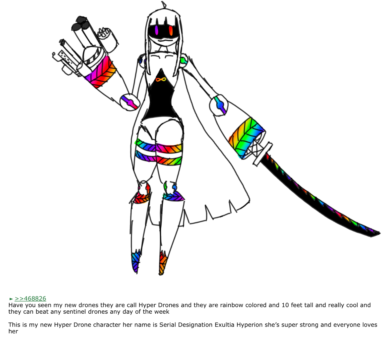 >>27202 >>27205 Hello Friend! It is exciting to know, and take your time as always. And do not worry, I can understand that you have your difficulties for a variety of reasons, like thinking in drones, in your case I assume Alice, sometimes I think of V and I can't concentrate to write. Alright, I don't like to be too critical to a gift, but if you ask, the spikes on the arms, she doesn't have those, the forearms and lower legs are thicker than a normal DD, and that's pretty much it, by the way, loving it, even when it's just practice.