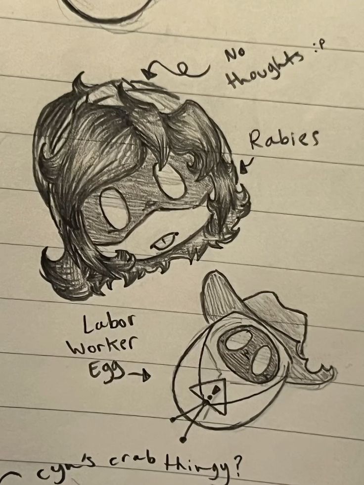 Arrow Creature (still don't have a name for her) >the one Uzi made in episode 4, now grown up >basically living like a goblin this whole time >can't even speak, mostly animalistic >been living like this for a few decades before meeting O when they're both looting the same building on accident >some sort of spark of kinship seeing their skin being the same (both normal Solver organic matter) >spend a few days living around each other, observing but not interacting >eventually start interacting and living together, bonding over the fact they both can drink oil >he has to teach her how to speak >asks her where she came from, she replies with a crude and vague drawing of a Worker Drone. O doesn't know what this means and it seems she doesn't quite know either >more bonding, years pass >maybe the dynamic turns into something more idk Would be funny to have them meet Uzi and N later down the line. I might shove them into the fic if I can think of what they'd add to the story, if it's worth it