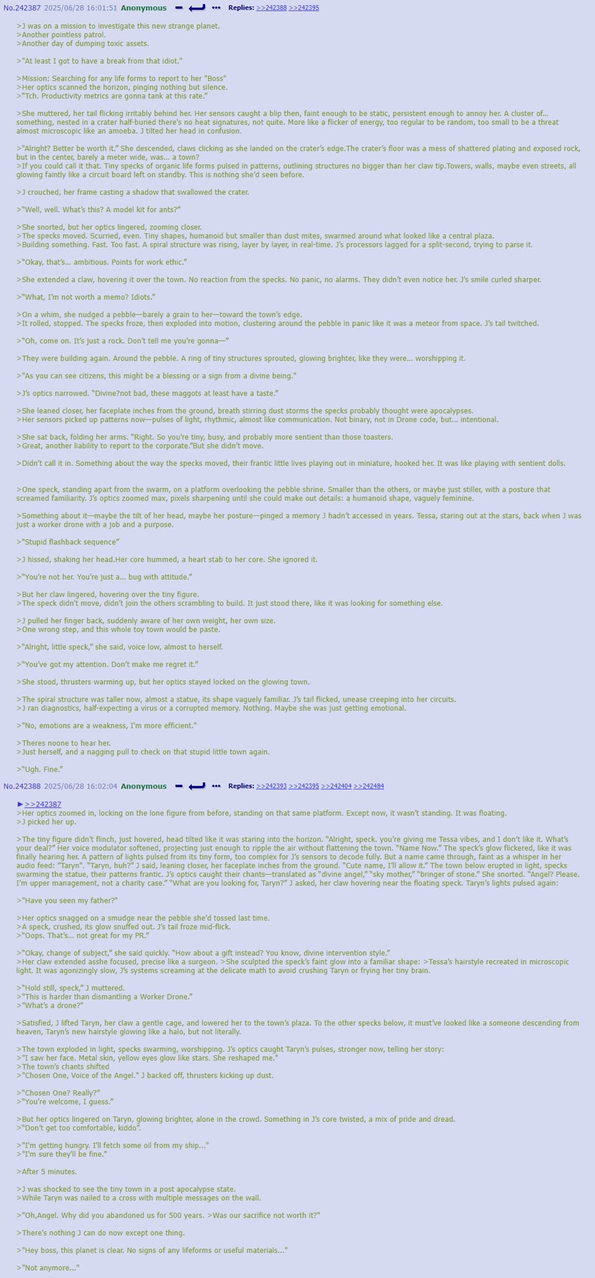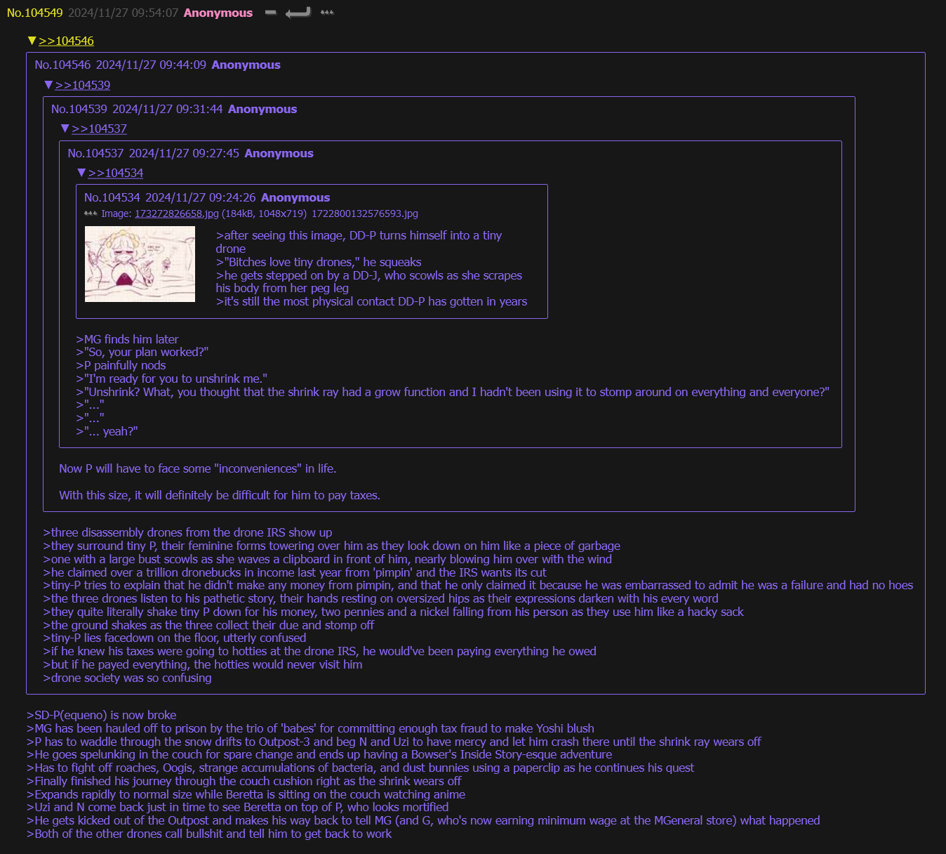 >human society on exoplanet getting invaded by the solver >realize their best course of action is to hidr >have an amazing idea: >shrink the society’s size down so they can hide more easily from the now giant drones >fail to realize that Murder Drones have sensors with presicion in the nanometers >also fail to realize their WD servants, whom werent shrunk down for safety reasons, might have some delusions of grandeur from their new size >shenanigens ensue Something with more creativity should write more based on this…