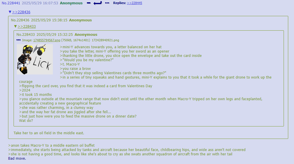 >>271815 >>271850 Yeah, I can appreciate giant drones too, though I prefer when they’re more drone like in appearance. Frankly, I just wish there was more content. >>271872 Sir, that makes it better?