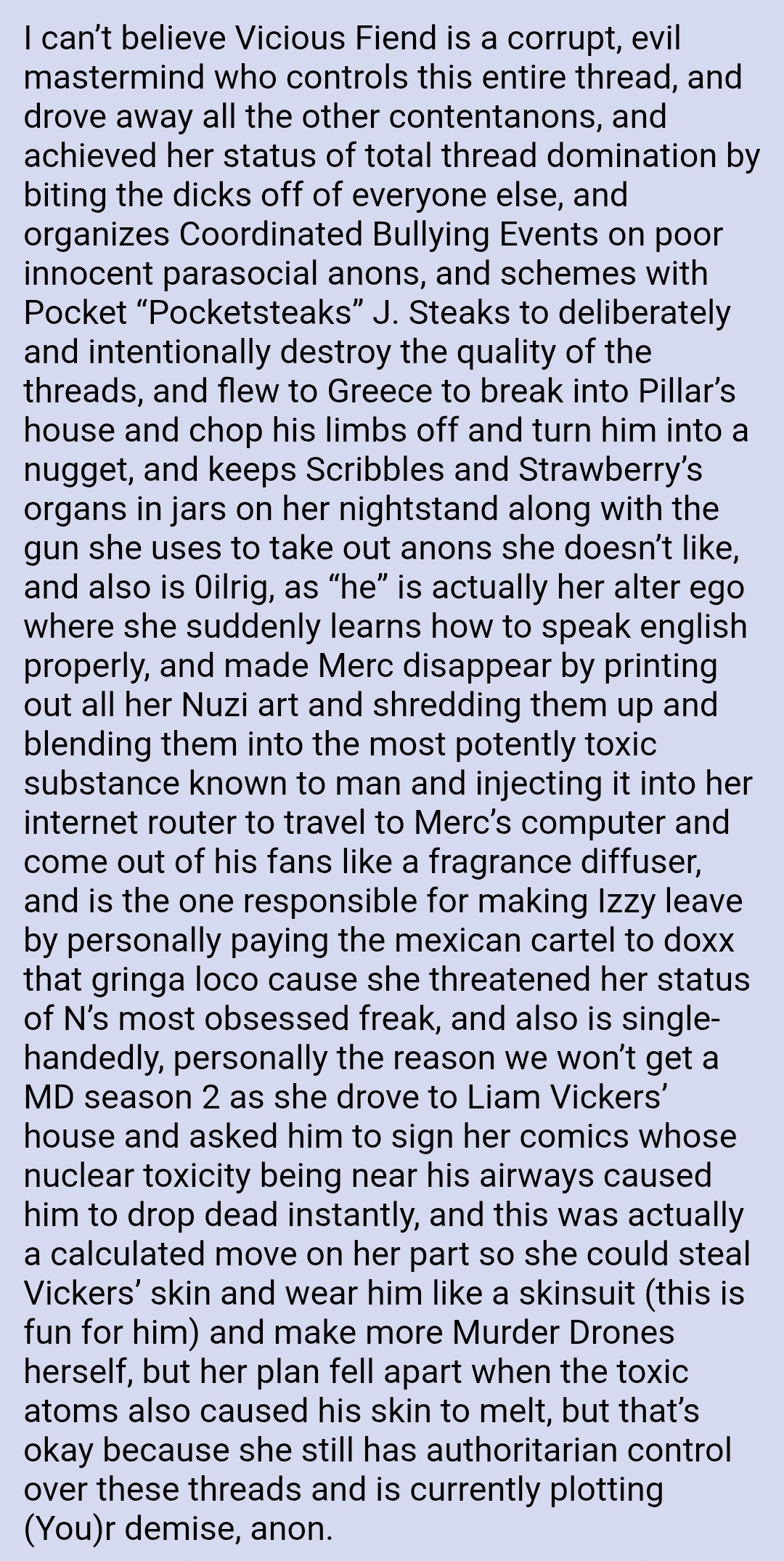 >it turns out that the writer for the graphic novel knows about /md/ >and he fucking hates us >we only learn this when the comic starts coming out and he references /md/ creations in the most spiteful ways possible what happens to (You)r favorites?