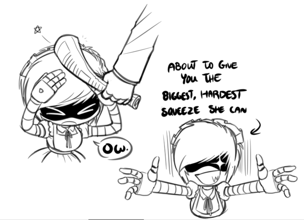 >/md/ Kombat >SD-Y uses her sword for most of her attacks, one of her fatalities includes firing Mini-Y out of her hand-cannon which blasts a hole in her opponents ribcage where Mini-Y immediately begins slashing up their organs >SD-E uses her gun and claws for attacks, one of her fatalities is her losing her hat and clawing her opponent in a berserker rage until they're nothing more than an oily/bloody puddle >Pepper The Soda Drone is mostly a long to mid-range fighter, using her soda as a projectile; One of her fatalities involves pinning her opponent down and forcing a jet stream of soda down their throat until their organs burst >Negev is an agile fighter mostly using mostly rush attacks, with both her hands and teeth as weapons, her fatality involves Doll, Rebecca and Emily possessing the opponent by taking control of each of their limbs and pulling them out of their sockets