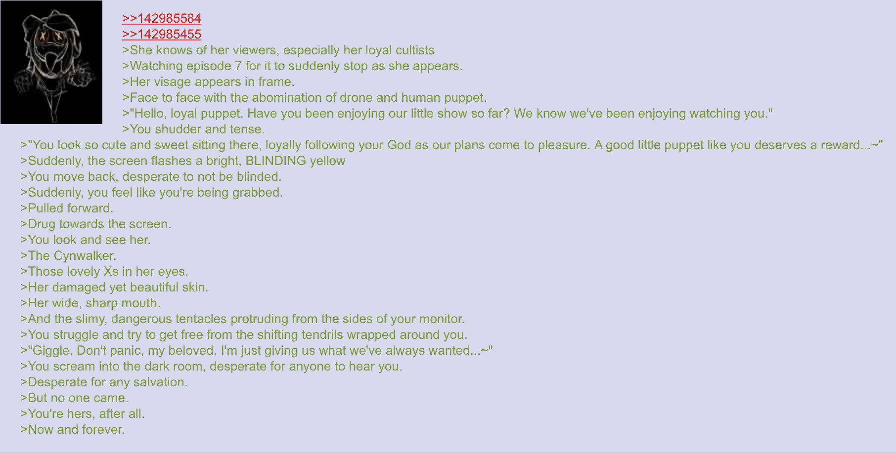 Bonus: >J0y is impatiently tapping the screen on the Laborer she’s infected and possessed. ”Holy kilobytes, can this eldritch bitch get to the point already and CRUSH these drones into oily stains?! It’s what tin buckets like them deserve, User~”