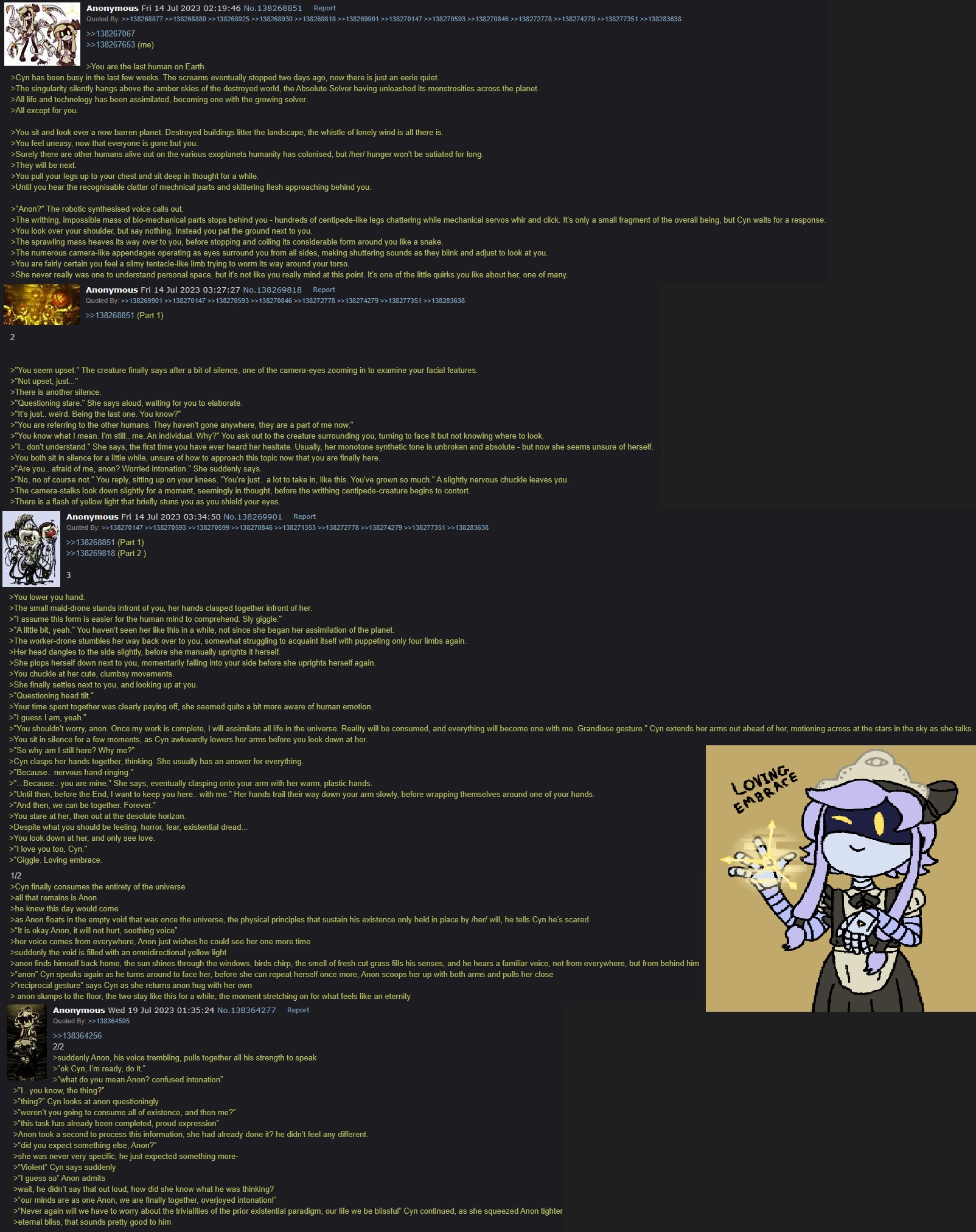 >>28082 Same. I may not have been a significant figure, but I'm glad I indulged a latent autism to have fun here. Heck, I don't think I'd ever writefag at all.