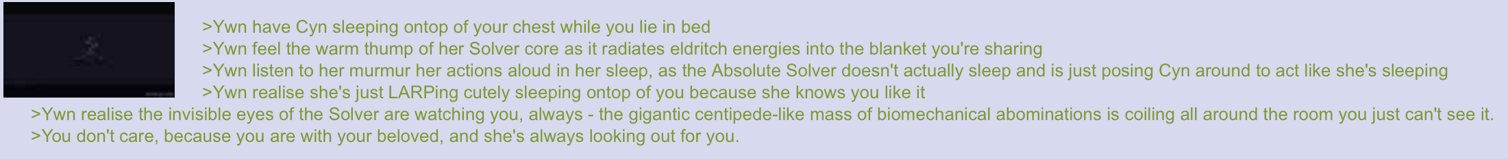 >You wake up in the night but you can't move >A vickers girl has induced sleep paralysis on you >Careful to stay out of your line of sight, she rolls you on your back >She massages your back and kisses it >"Please don't scream" she says. "I just want some human contact."