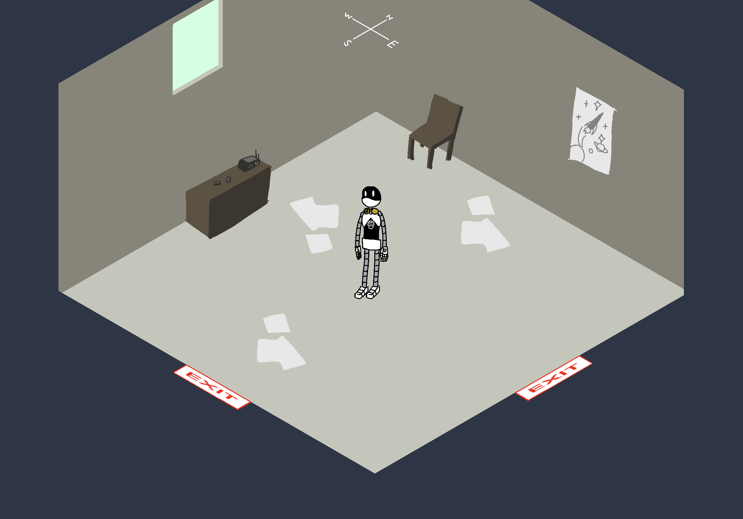 >you are standing in your room, it is messy, a poster hangs on the wall, there is a chair and a desk, the desk has some data-tapes and a hyperwave radio on top of it and a coat inside it, to your east is the kitchen, to your west is the exit