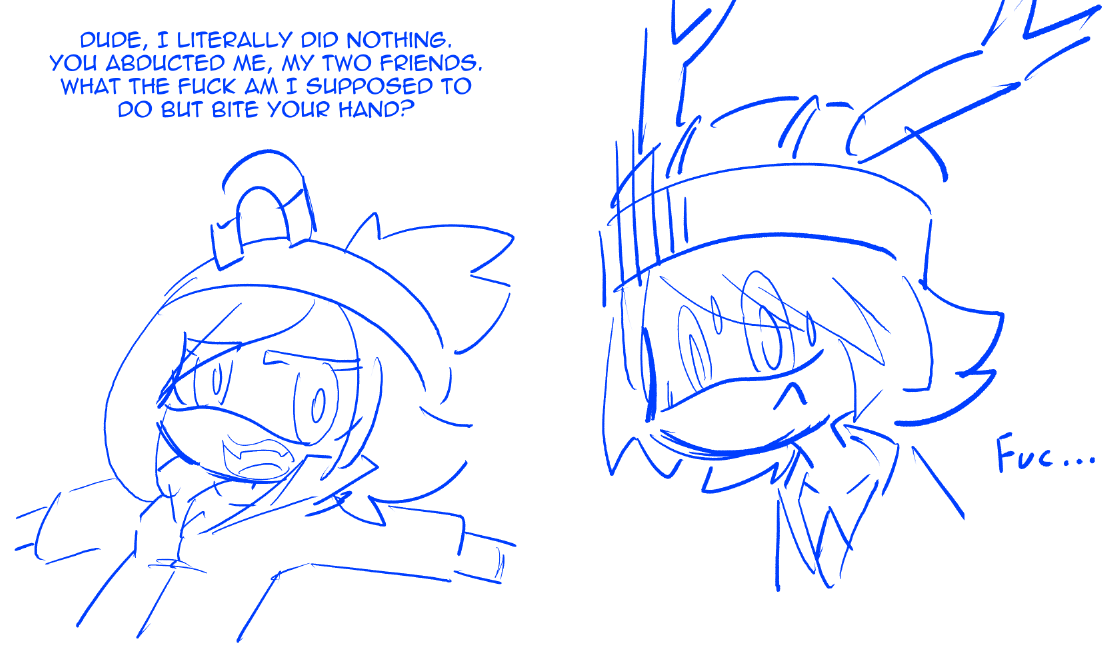 >J spends the better part of a year living by herself in the pod she's trying (and failing) to fix >J scavenges the ruined cities & industrial complexes of Copper-9 for ship parts and/or oil, resulting in more than a few encounters with various characters (eg. Alice) >J goes to great lengths to avoid being discovered by Uzi & Company (eg. Choosing to eat roboroaches over risking the attention that trying to hunt Worker Drones bring) >J gradually grows more unhinged over a combination of things (failure to fix the ship, paranoia over being caught, general mental angst being made worse by continued isolation, etc) until she finally loses her shit and does something stupid >J inevitably gets herself captured, being subsequently interrogated by Uzi & Company in a bid to figure stuff out (eg. Where was J planning on going with the pod?) >J reveals the truth; She was planning to drift aimlessly through space in order to get as far away from her new "Boss" as possible >J also insinuates that Uzi is likely just as bad (if not worse) of a "Boss" than Cyn, and admits/begs that she'd rather just "retire" >J is (un)fortunately spared from being perma-killed for two reasons: Because N successfully convinces Uzi not to go through with it (at least until J can "even out her karma") & because Uzi doesn't yet know how to delete/remove 'souls' assimilated by The Solver (with Cyn of course refusing to teach her) >J ends up being (forcefully) integrated with the rest of the Post-Canon cast, acting as Uzi's extremely reluctant (yet nevertheless professional) personal 'secretary' in the hopes that her new "Boss" will be the one to finally end this eternal dream