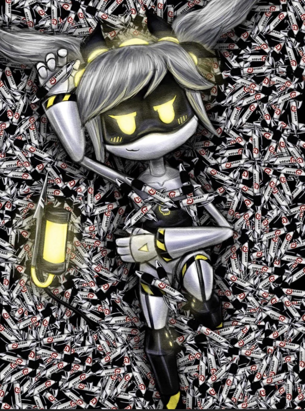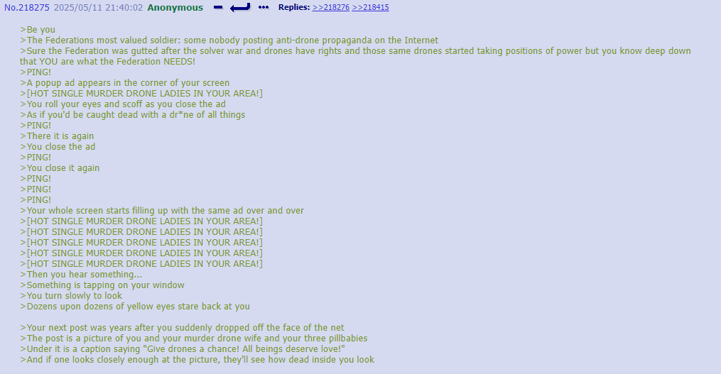 >"Ha,I got you Anon." >It's endearing. >Doorbell dings again. >Open up, not the usual crowd. >Just some weird-ass drone and naked too. >Didn’t bother with any costume at all. >Just standing there >No "trick or treat," nothing... >Just staring with that annoying smirk on her face. >"wtf is this" >You hand her some candy anyway, maybe then she leaves? >She doesn't budge. >You close the door, turn around >She's already in the living room, eating a bowl of batteries. >"How...?" >You yell at her to gtfo. >You shove her outside for real this time. >locked every door, double checking every windows. >No sight of her. >You felt relieved until... >You hear munching sounds from the kitchen. >She somehow back. >This bitch is like a bad skin irritation. >She won't stay away. >You try everything. >Nothing works, she worms her way in every damn time. >You finally snapped and grab the nearest thing. >A heavy-ass bowl. > You whack her stupid head with such force. >Now she's unconscious with cracks on her visor. >She collapsed to the floor. >Finally peace until she got back up but something is very wrong this time. >Her moves are jerky and unnatural like puppet on strings. >She move forward towards you. >You froze from the confusion and the curiosity.