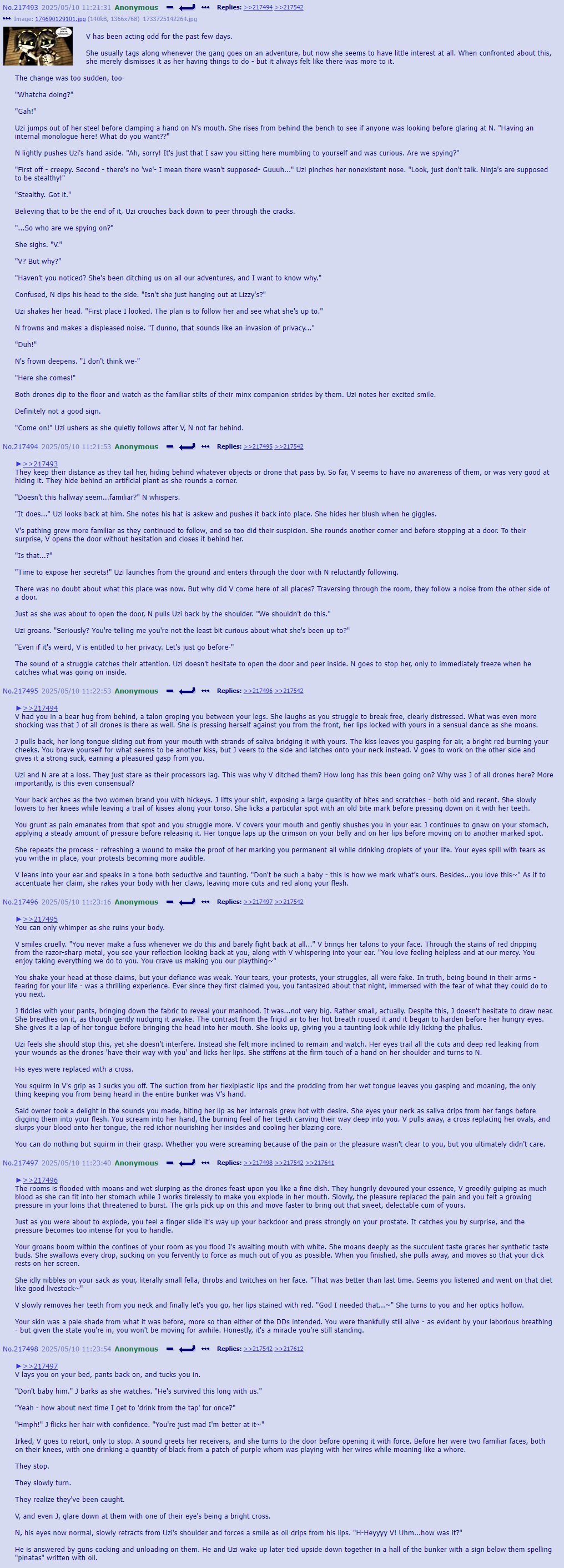 >>280295 >At first you didn’t understand what Y meant by waterless shower, but now faint words of advice from the past resonate in your head >Nevertheless, you can feel their tongues on your body >Theta and Delta licking up and down your legs, Phi and Y doing the same to your arms >The four points of contact with your skin, moving around, leaving behind a slick trail of drone saliva >After a while Phi and Y move onto your back and stomach >You can feel Phi moving up and down >You see Y’s head raise up to your neck and move down to slightly above your groin >Theta and Delta begin to cover more and more of your legs with their motions >Said legs are having an increasingly hard time keeping you standing >Yet despite your wobbly legs and sleep deprivation a certain part of you is standing at attention >You can feel it >You can also feel and see that Y stopped >She’s squatting in front of you, eyes fixated on your privates >After a while she begins to lick up >Up to your chest, neck, ending with her tongue on your cheek >She pulls away for a moment “Anon~ You have such a big rifle, how about ve help you clean it~?” >Before you can say anything she moves down again >You try to stop her with your hands but Phi grabs your right arm while Theta moves, hugging you from your left side, keeping your arm immobilized as she begins to lick your upper torso >Without the ability to defend yourself Y takes the entirety of your “Rifle’s” “Barrel” into her mouth >Y is very thorough in “cleaning” >You can feel her massage your “Barrel” with her tongue, starting from the tip and moving to the base >The suction you experience is unlike anything you’ve felt before >You need to brace yourself to avoid a “misfire” >Phi’s licking is moving up and up >She’s currently circling a spot on your neck, Theta is doing the same >All the while Delta moved himself closer to Y and began fondling your “Magazine” >Phi made the next move, her teeth made two pinpricks in your neck, Theta followed and did the same >You can feel both of them drink your blood >Phi greedily sucking from your wound, Theta gently lapping up the blood as it flows out, occasionally giving you a kiss on the neck to get a bigger gulp >Y released your “Rifle” and began running her tongue along its side >Delta moved even closer and began doing the same from the other side >Your senses are overwhelmed, you lose track of time, how long has this gone on? >All you know is that you’re at your limit >Your vision begins to darken from blood loss and fatigue >And your “Bolt” is about to strike the primer >You won’t hold out much longer >In fact you’re pretty sure you’re going to shoot your shot >NOW >You feel bliss like you never did before, a high so extreme it may stop your heart >You’re not sure if it’s from the pleasure or the blood loss >What you do know is that your vision is being rapidly consumed by darkness >It’s all dark now >Are you… >… >You awake the next day >Tired and completely sore >Was… was that a dream?
