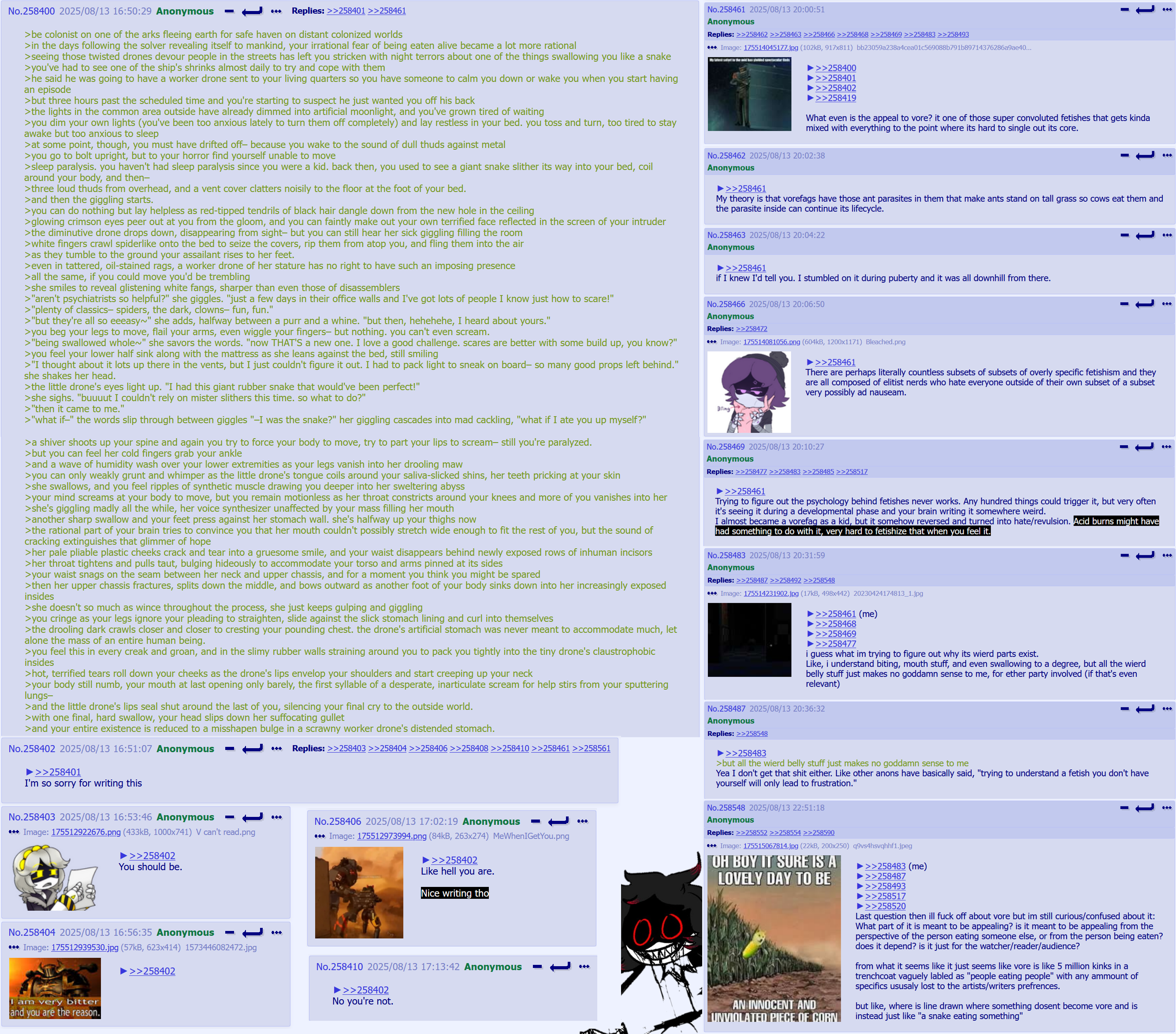 >She grabs your cheeks. >Her face only inches from yours. >Her Fingers clamping your jaw wide open with unnatural strength even for a worker drone. >Then she leans forward >And shoves her head down your throat. >You’re sure she won’t fit. >Jaw’s about to break or so you thought. >Her form shifts in the middle of the process. >Her cold metal texture turns slimy and slippery. >Her hair brushes the back of >Your tongue, tickling... >Not the good kind. >You can’t tell if you’re choking, uncomfortable, or just terrified >And she keeps sliding in...
