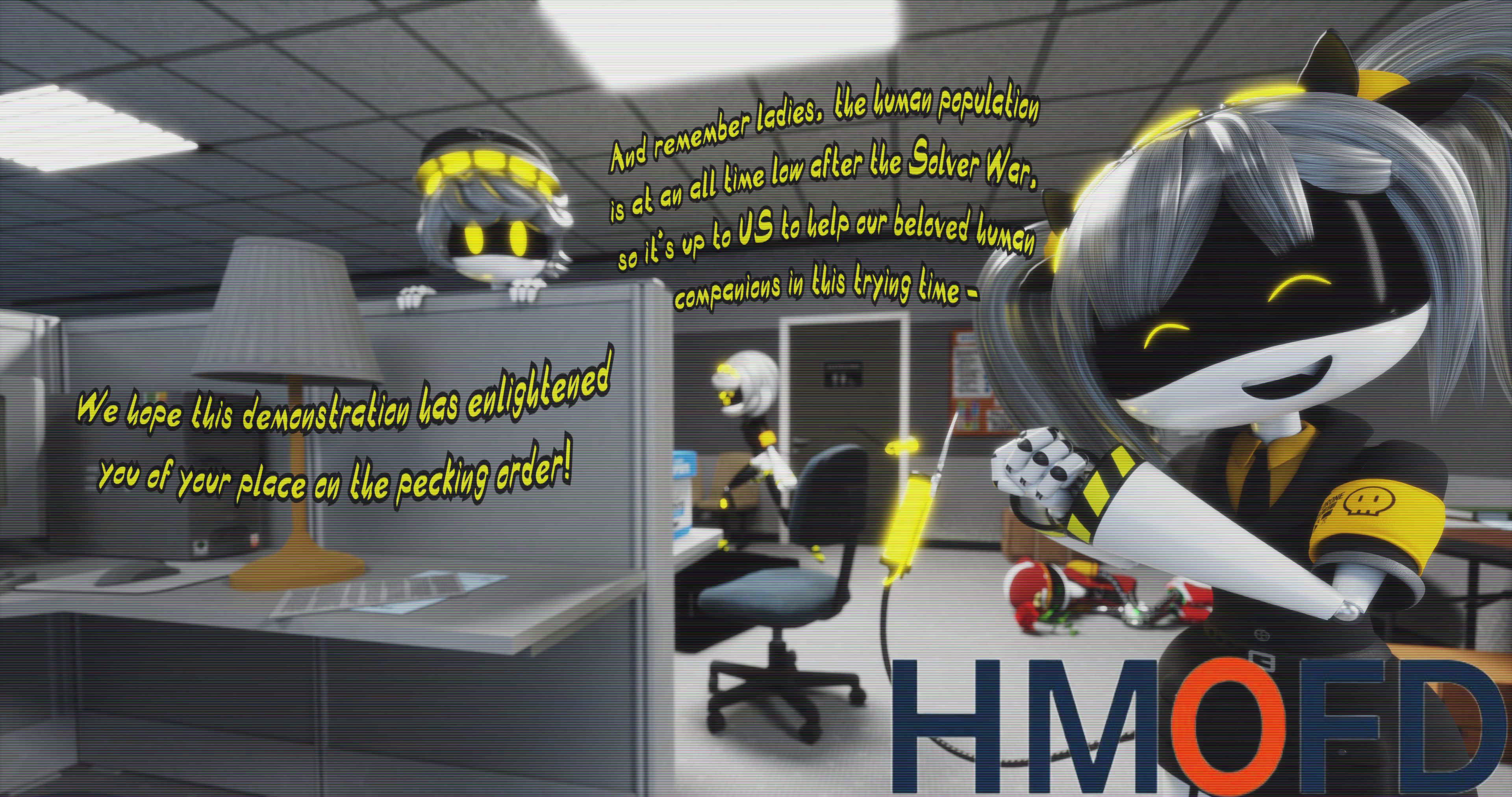 >>284361 >work in a drone-integrated office >despite your best efforts, it's a cutthroat business >your disassembly drone subordinates regularly murder one another (it's okay, they get better) >the workday often ends with the entire office decorated with bullet holes, bisected from laser beams, on fire, exploded, or covered in drone gore >today was a particularly violent day >someone emptied J's stapler >by 9am she was the only drone left in the office >this leaves her with the rest of the day for smoozing her boss (you), her favorite activity except maybe for murder it's hard to tell sometimes >she drags a water cooler into your office, the fluid inside sloshing and occasionally spilling out from one of the several bullet holes running through the plastic >J proceeds to make water cooler small talk with you and give you unsolicited stock market advice as you try and get work done >she takes lunch in your office as well, chowing down on bits and pieces of several of her murdered coworkers >all of which goes straight to her hips and thighs, which she spends the last half of the day firmly plopping in your lap while she watches you work >she starts overheating on you near the end of the day as you start putting in work requests for the (unpaid) janitor drones to clean up the office, your dominance over the janny drones sending her into a lustful fugue >J forces you to open and subsequently accepts a request for a security detail at your home tonight >she'll be getting overtime as she bounces on your dick tonight