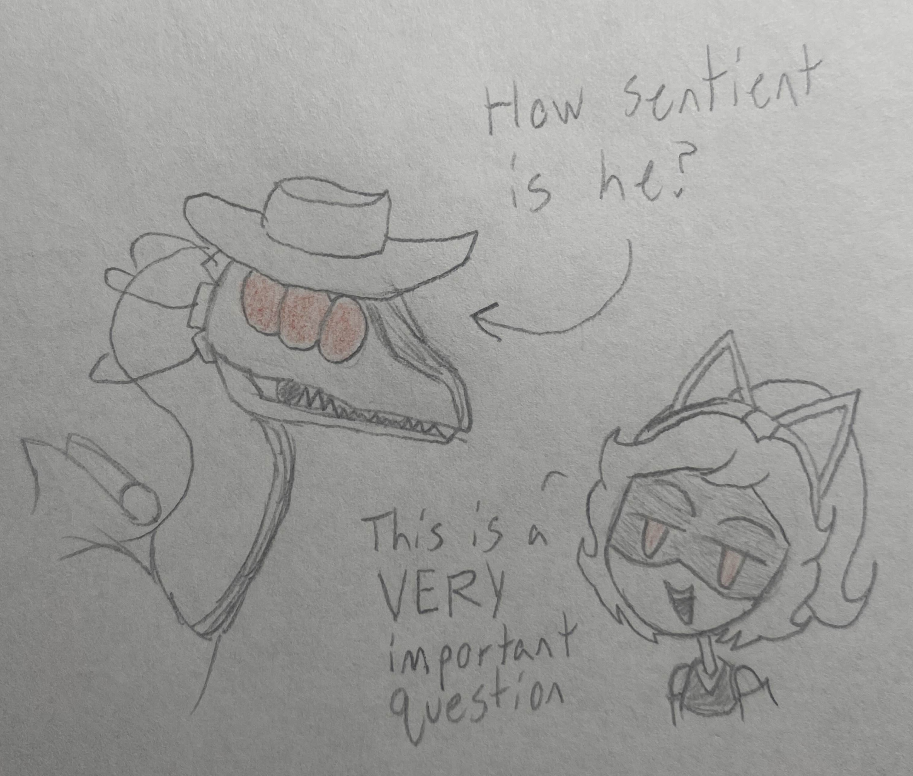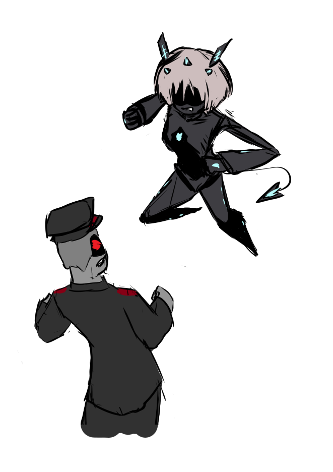 >>272416 Back to the flow! >You walk with Sophie down the forest trail, still analyzing the natural world around you as she bounces ahead. What planet was this again? It’s not Earth, because that training video said Earth was destroyed. So what’s with all the Earth animals and greenery? Did they somehow manage to move a bunch here beforehand? Probably. God this entire thing just brings up question after question for you. Honestly you’re rather concerned for the guys back on Titan, because what if whatever hit Earth comes for them next? It’s an itchy feeling at the back of your mind, one that made you really want a two way communicator or something. >SPLASH >You’re snapped out of your dazed state by the sound. You snap toward its location, only to find Sophie jumping around in well, a stream. You kinda hope her backpack is waterproof, because you can’t imagine wet snacks tasting good or a wet video player functioning. She almost seems to come to this conclusion at the same time you do, and takes off her backpack before handing it to you. You take hold of it without a single word and hold it in your arms gingerly. You don’t feel like sitting down though. You feel this unexplainable need to be vigilant, but you’re not sure where it’s coming from, considering how peaceful this place seems. Maybe it’s just your nerves telling you otherwise. Maybe the comment about the temple made you a bit uneasy because you don’t know what that is and think it could be dangerous subconsciously. >Then you see it. The world almost seems to slow to a crawl the moment you notice it. 5-ish yellow glowing dots and a big glowing yellow X. You… You’ve heard of those in urban legends, but… They’re real now. The Murder Drone. A horrible thing, built much like yourself. The horrid thing’s gaze is fixed on Sophie, who’s still jumping in the river, oblivious. Something deep in your soul tells you something >PROTECT THE WORKER >The next moments are a blur, but when the chaos stills, you have the Murder Drone pinned to the ground with one hand around its neck, your tail-stinger mere centimeters from its head. To which its eyes turn blue and it lets out a belly laugh that kinda sounds like a fusion of a dinosaur and a train of bees crashing into a schoolbus. Some text appears on the screen of the Drone you have pinned down “You passed the test, doofus! Your protection instinct is working just fine! Name’s H! And before you say anything, Sophie was kind of in on it.” >You turn to Sophie, who’s looking at the both of you and waving. She exclaims >“Mommy wanted me to test your IN-STINKS!” >…Well that made you feel like a dummy, didn’t it. You stand up and ask the question that’s been bugging you for the last like 30 seconds: What kind of name is H? H’s visor says “From what I can tell you don’t even have one. >…Point taken “Anyways, I should get going back to my patrol. They took me here to help you with training, but now I gotta get back to the planet I was stationed as so I can sexually harass everyone.” >…Huh? Wait maybe that’s what H stands for 8/??