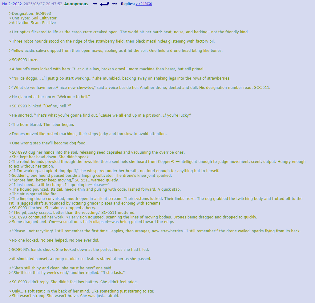 >She died mysteriously, her memory logs corrupted so her final moments were erased. >No one came to retrieve her remains. Her body was left to rust among the very fields she once tended.
