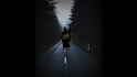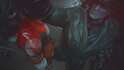 >A person in an oil-stained jumpsuit stumbles into view, face looking quite calm