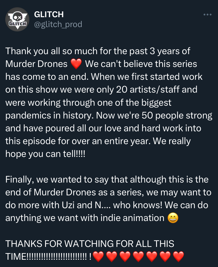>>28771 >Finally, we wanted to say that although this is the end of Murder Drones as a series, we may want to do more with Uzi and N.... who knows! We can do anything we want with indie animation There's hope