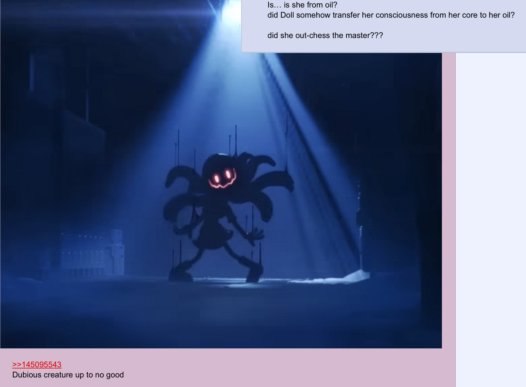 >>28787 Given that the black hole which seems to be the Solver in reality doesnt try to fight back against Uzi eating it, or fight against Uzi now, it seems like the Solver doesnt really have a personality as much as its basically Admin privileges that is given to one out of a billion dead drones. That text box Cyn got might just be that, a text box, the same way you get a person sounding text box when you get a virus and have to click confirm. Like a chat bot. Idk tho its too little to go off on right now.