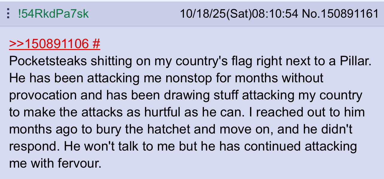 >pillar acting like the poor, innocent victim of a coordinated harassment campaign orchestrated by the evil mastermind pocketsteaks same as it ever was