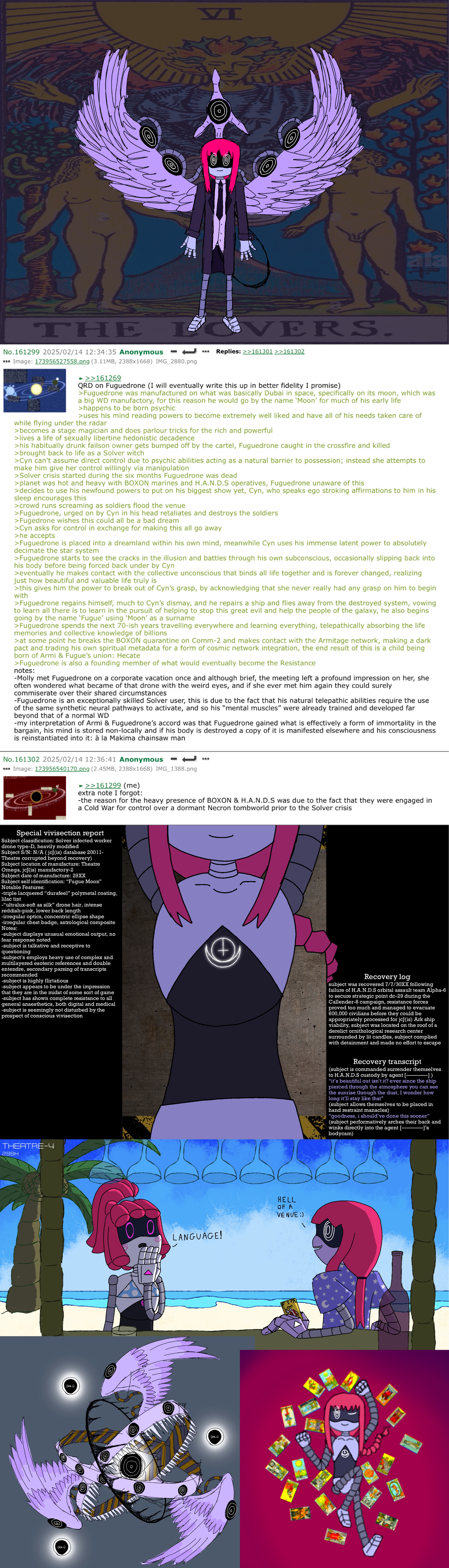 >The Anons don't realize that Liam as the main writer can just bring in a new Eldritch Drone antagonist that beats up Uzi so she can have motivation to actually learn how to use The Solver powers to the full extent >Side plot about Nori trying to find a way to copy the patch and exploring some unseen part of CFL >Antagonist being a mirror of Uzi with a similar journey, but a slight difference in the choices Anons need to realize Liam could literally do fucking anything