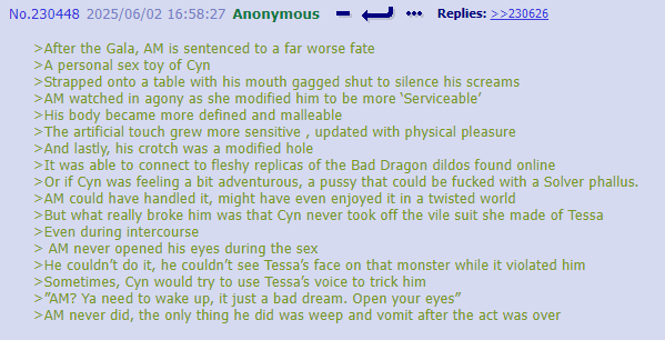 >>290618 Ah, the usual HoDR, well, Cyn just rapes him. Like, she's a god there and just decided to fuck everyone, so AM is in for a very interesting, never-ending train of all sorts of impossible entertainment.