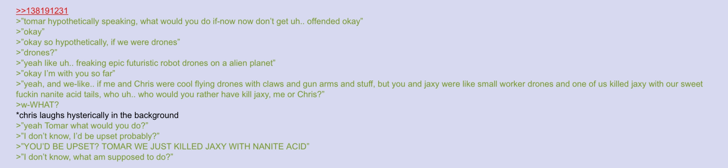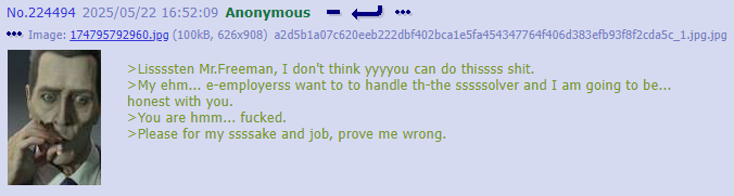 >>290021 >Anonbot 5000 going to fulfill his lifelong duty of posting in /md/ again >Faulty programming, can only write one thing in each thread >Anon responds >pic related
