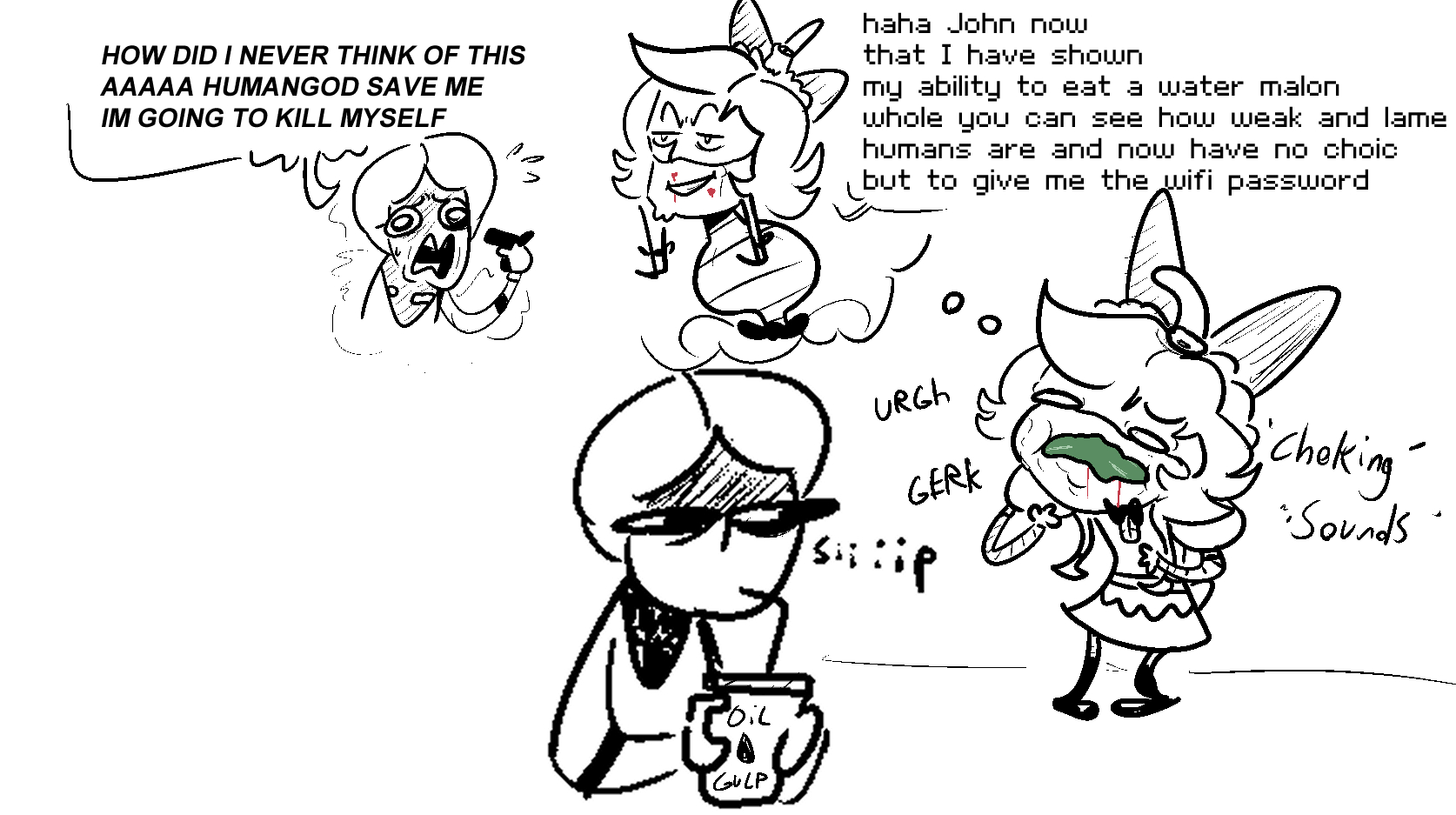 >>290684 >Then John C. Glitch wakes up. >The several $10,000 a night whores dressed like Princess Peach and Pomni, among others, look at him with worry. >"Go back to sleep, babe." >Must've just been his imagination...