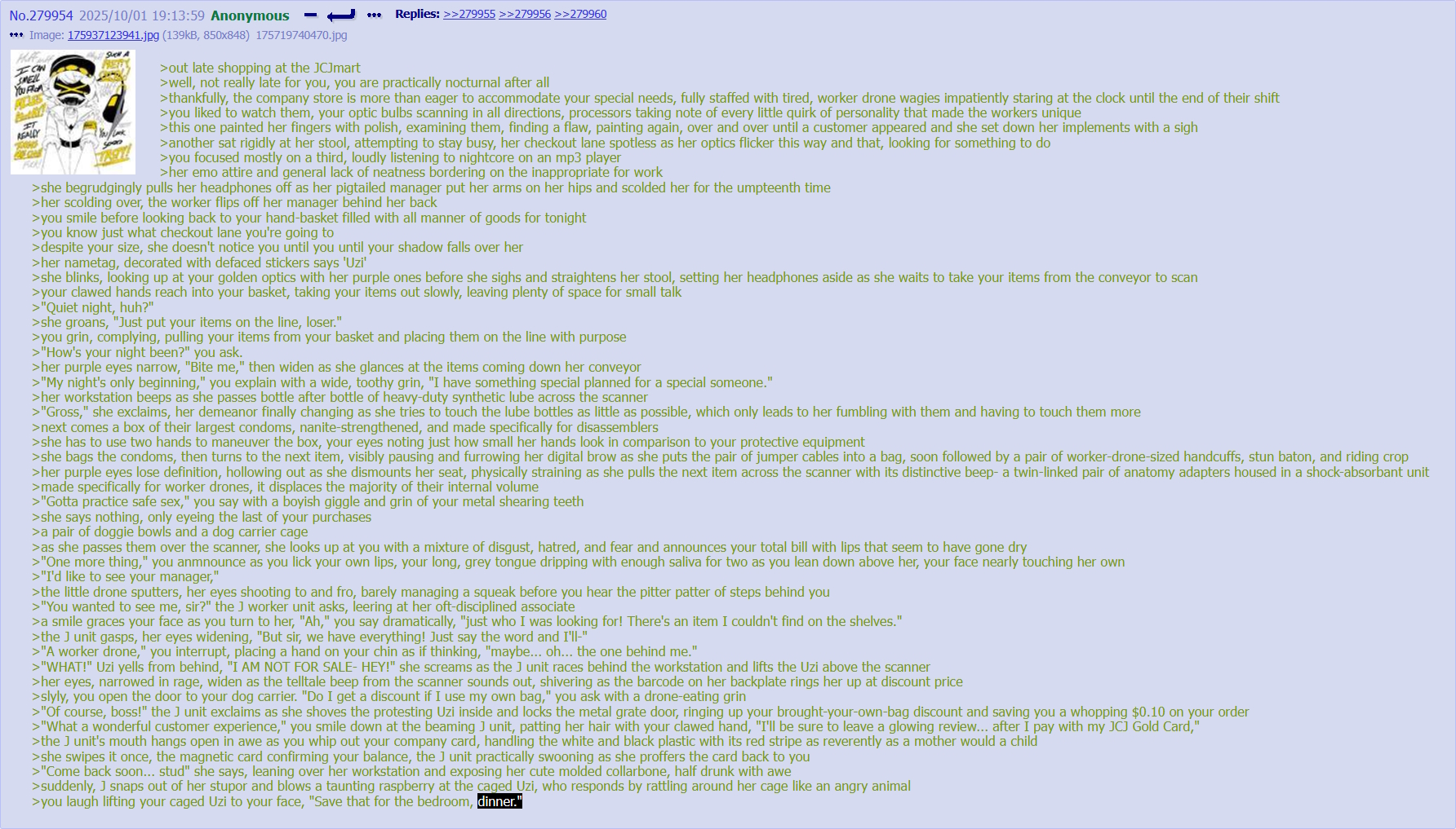 >>290033 >Anon does some steamy human-machine interfacing with J during her 30 minute lunch break. >While winding down, he chuckles to himself >"What is it, Anon?" >Nice hustle, tons-of-fun! Next time, eat a salad!
