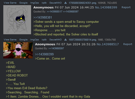 Alright anon, are you staying with the d'ru or defecting to the dr'i? >>291689 This coincidentally is similar to another feature I wanted to see on the booru, but for the booru itself and not the wiki: transcripts of each green. Ideally, greens could just be saved as text. I even though of writing a "quick paste" option so you just copy the entire post and ctrl+V it into a text box that extracts all the metadata. Having an image fallback would be nice, but storing it this way would be a lot less memory and let people screenshot with different formatting or whatever. Could even have a button to change theme on greens, go wild! Of course, I have no idea how the booru works underneath, so maybe that's easier said than done.