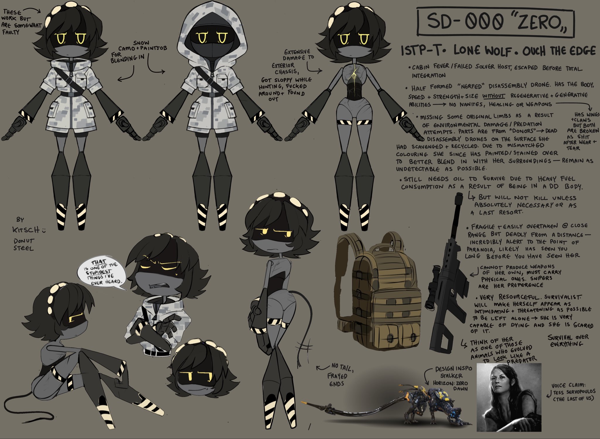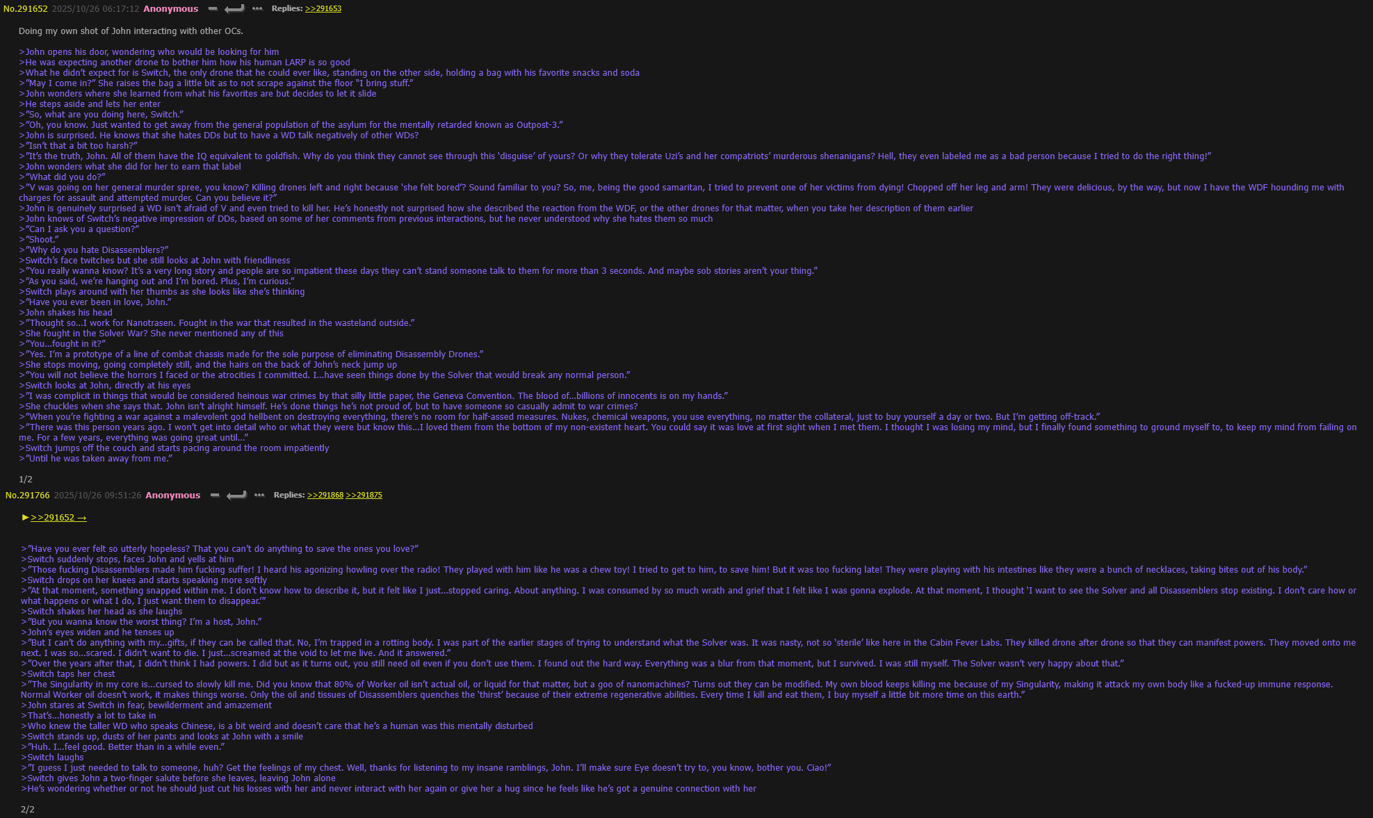 >”Have you ever felt so utterly hopeless? That you can’t do anything to save the ones you love?” >Switch suddenly stops, faces John and yells at him >”Those fucking Disassemblers made him fucking suffer! I heard his agonizing howling over the radio! They played with him like he was a chew toy! I tried to get to him, to save him! But it was too fucking late! They were playing with his intestines like they were a bunch of necklaces, taking bites out of his body.” >Switch drops on her knees and starts speaking more softly >”At that moment, something snapped within me. I don’t know how to describe it, but it felt like I just…stopped caring. About anything. I was consumed by so much wrath and grief that I felt like I was gonna explode. At that moment, I thought ‘I want to see the Solver and all Disassemblers stop existing. I don’t care how or what happens or what I do, I just want them to disappear.’” >Switch shakes her head as she laughs >”But you wanna know the worst thing? I’m a host, John.” >John’s eyes widen and he tenses up >”But I can’t do anything with my…gifts, if they can be called that. No, I’m trapped in a rotting body. I was part of the earlier stages of trying to understand what the Solver was. It was nasty, not so ‘sterile’ like here in the Cabin Fever Labs. They killed drone after drone so that they can manifest powers. They moved onto me next. I was so…scared. I didn’t want to die. I just…screamed at the void to let me live. And it answered.” >”Over the years after that, I didn’t think I had powers. I did but as it turns out, you still need oil even if you don’t use them. I found out the hard way. Everything was a blur from that moment, but I survived. I was still myself. The Solver wasn’t very happy about that.” >Switch taps her chest >”The Singularity in my core is…cursed to slowly kill me. Did you know that 80% of Worker oil isn’t actual oil, or liquid for that matter, but a goo of nanomachines? Turns out they can be modified. My own blood keeps killing me because of my Singularity, making it attack my own body like a fucked-up immune response. Normal Worker oil doesn’t work, it makes things worse. Only the oil and tissues of Disassemblers quenches the ‘thirst’ because of their extreme regenerative abilities. Every time I kill and eat them, I buy myself a little bit more time on this earth.” >John stares at Switch in fear, bewilderment and amazement >That’s…honestly a lot to take in >Who knew the taller WD who speaks Chinese, is a bit weird and doesn’t care that he’s a human was this mentally disturbed >Switch stands up, dusts of her pants and looks at John with a smile >”Huh. I…feel good. Better than in a while even.” >Switch laughs >”I guess I just needed to talk to someone, huh? Get the feelings of my chest. Well, thanks for listening to my insane ramblings, John. I’ll make sure Eye doesn’t try to, you know, bother you. Ciao!” >Switch gives John a two-finger salute before she leaves, leaving John alone >He’s wondering whether or not he should just cut his losses with her and never interact with her again or give her a hug since he feels like he’s got a genuine connection with her