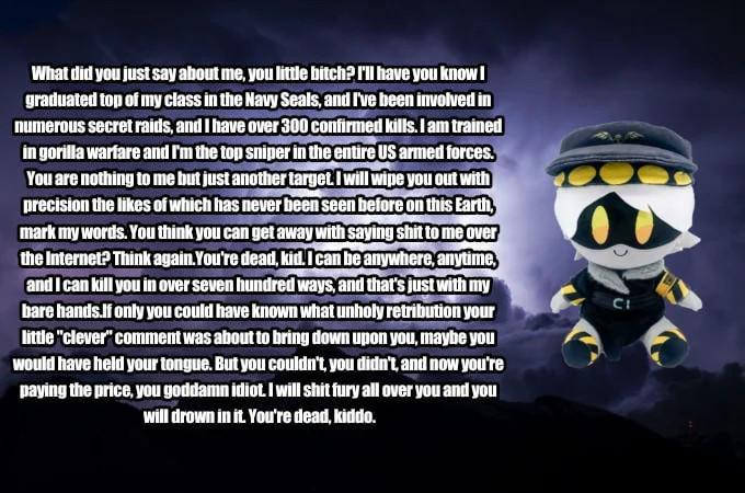 >>292125 >Tessa is asleep in her bed >Suddenly she awakens to the shouts of an angry autistic. (She’s also autistic, she knows the language) >Its her murder drone “friend” J >In her mouth is an angry little drone dressed in hot topic >”BITE ME!” >Its 3 AM