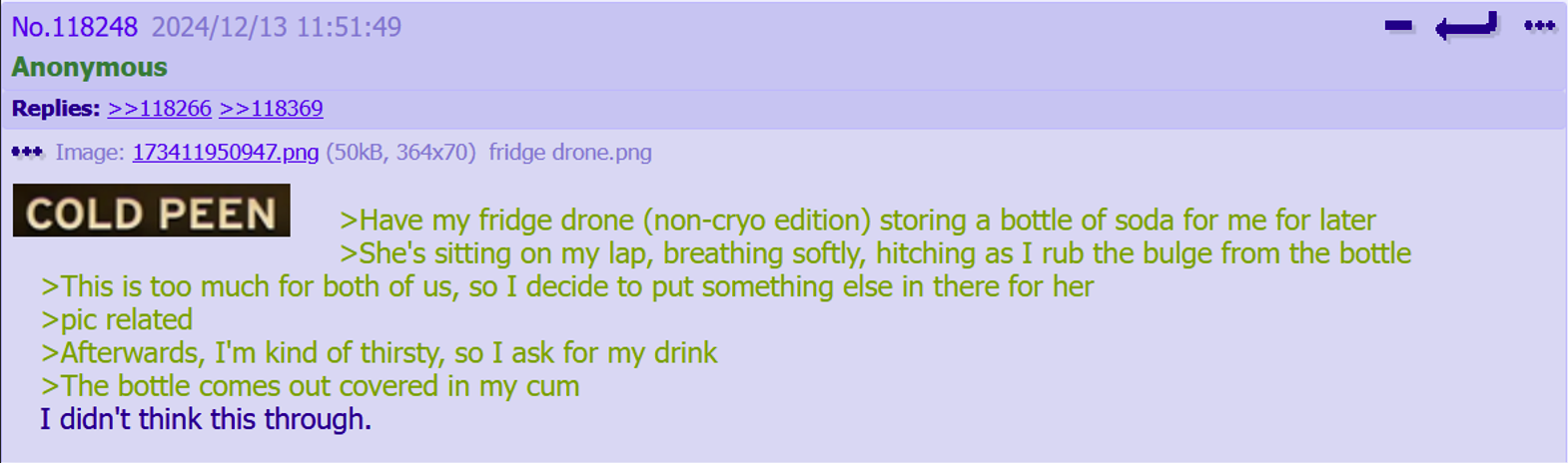 >>292132 might be on to something here: Cici, as a drone she is, makes you address the weirdness of her assets first before you can really focus her personality. For the fridge drones, the weirdness mostly comes from how you decide to interact with them. As long as your not purposefully weird with them, the fridge drones are nothing more then small, cute little drink holders.