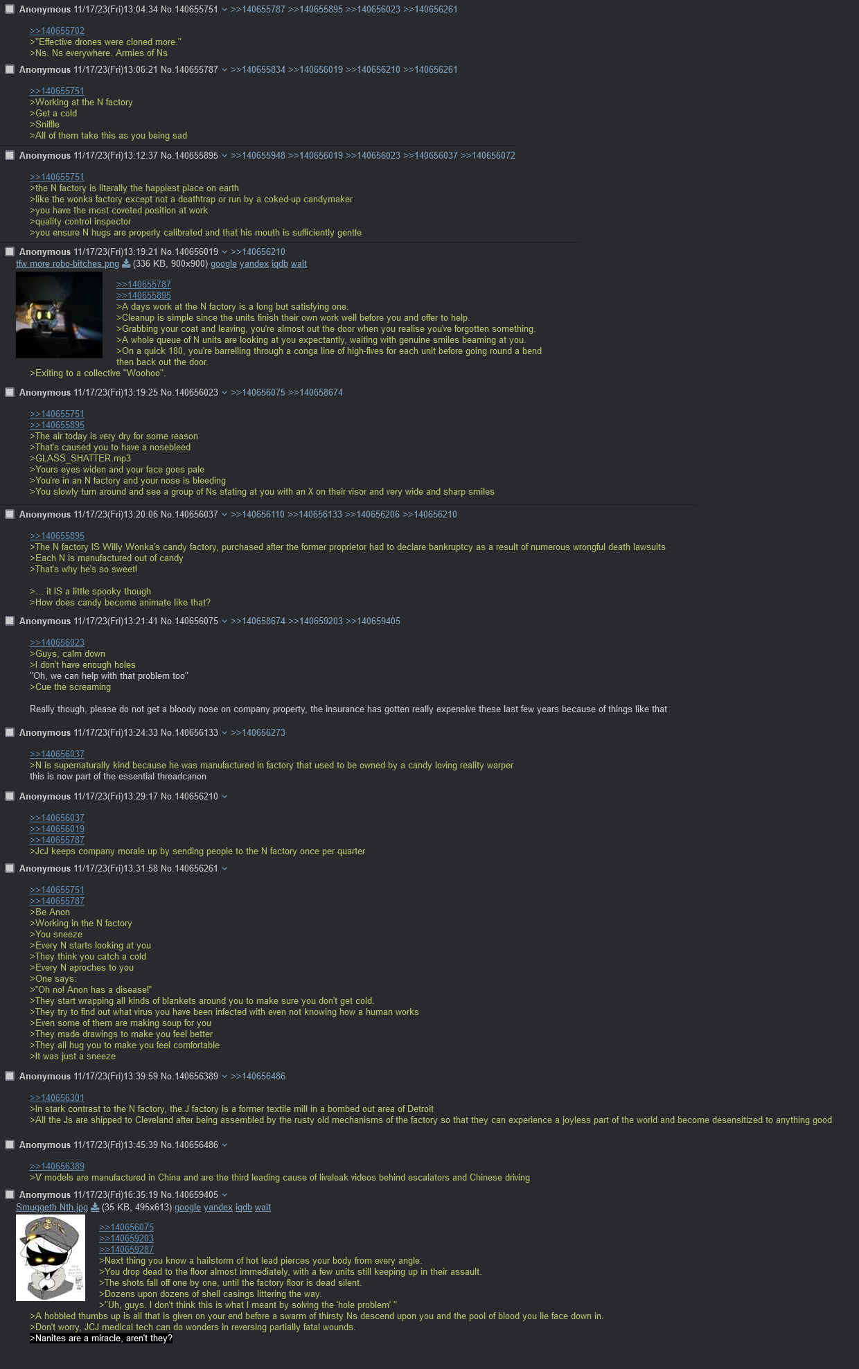 >Be nuclear power plant supervisor Anon >It’s a pretty good job >You’re technically a government contractor for the military so the pay is good >The job was great for the first few months, sure the temperatures outside are absolutely freezing, but you’re inside all the time and this installation provides the nearby military base with both electricity and hot water so you’re not going to freeze your ass off any time soon >And this brings you to your main problem >The crew here rotates every 6 months >You started one month before the rotation so you stayed behind when everyone else left >Apparently, the rotation crew decided to take an extended vacation and no other workers were available >So you’re now running this facility by yourself >Everything is mostly automated and you’re there for the times a manual switch needs to be flipped >And having some alone time sounded nice at the time >But now it’s making you lose your mind >You’re damn lonely in here >Three months of close to no human contact >Hell, there aren’t even any drones around >Apparently, they don’t mesh well with crucial infrastructure like this >Sure, there are the occasional patrolling military drones who come around, but they never stick around for long >There was that one that got lost in a snowstorm and needed to wait it out >That guy was a proper weirdo, kept saying stuff like: “It has contingencies, however small and non-effective they may be,” then rambled about hate for a bit, then something about flowers >Maybe he was saying that due to overheating? >He was flashing overheat errors so you gave him a few oil rations you had in storage, not like there was much more to do with them >Your guest gulped them down in seconds, drank as if it was the first he’d had in a while >Took as many packs with him as he could once the storm cleared, haven’t seen him since >You’ve radioed in to the main base, of course, asked about him >They were kinda surprised when you described him >Red screen, optics and tail spike, wore a tattered coat >The response message made it more confusing >Apparently, they only have one red disassembler at the base, and he basically never leaves, also he wears sweaters >It was weird, at first they tried searching for him thinking he was a rogue drone but they didn’t find any traces of your visitor >The CCTV was down during the storm so no video proof either >Ever since, they think you’ve become a nutjob from isolation >M-maybe they’re right? You’ve heard things in the… >No, no, he was here, you’re sure, the oil packets wouldn’t go missing themselves >And you sure as hell didn’t drink them >But there is a silver lining to all this >The psychiatric evaluation (no, you did not see a psychiatrist, you filled out a questionnaire) determined you to be sane enough to continue work but required companionship >You don’t disagree with this diagnosis >You expected to get a co-worker at first but that idea vanished quickly >You’ve been issued a drone assistant >That was some week ago, so this drone assistant should arrive today >You can’t wait to have someone to talk to, really >You’re also a bit… touch-starved >Sure, you weren’t getting much physical contact before getting this job but now… >You feel a type of cold that a heater won’t help with >Maybe you could… >You’ll think about it later >You’ve just woken up >It’s 8:30 am, Thursday, November 23, year… {Xyz} >You’ve had trouble keeping dates for some time but… >No, no, you’re fine, you’re fine… >You just have to… go about your day >You start with your breakfast, protein-rich nutrient block with flavoring >You don’t eat anything else, normal food can’t be kept in long-term storage so close to sources of radiation, even if it’s negligible >And even if it’s negligible you have to take the pills >You swallow the plan... you swallow the iodine pills >You move on to the main control room >You used to occupy yourself by browsing forums and image boards on one of the consoles >You don’t really feel like doing any of that lately, also you keep getting range-banned so even if you wanted to, you’re not sure if you could >You can’t even watch some silly internet videos, the internet connection is shit around these parts >The radio communicator is close to being a piece of garbage as well, it only works one way and your messages can’t be longer than 10 seconds >You look at the status monitor