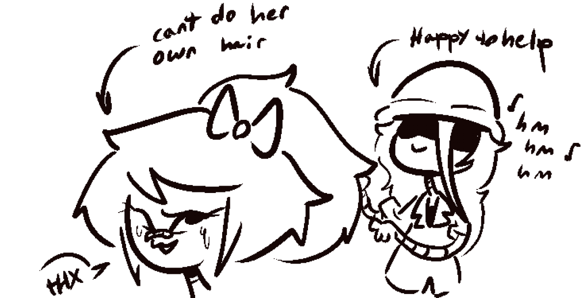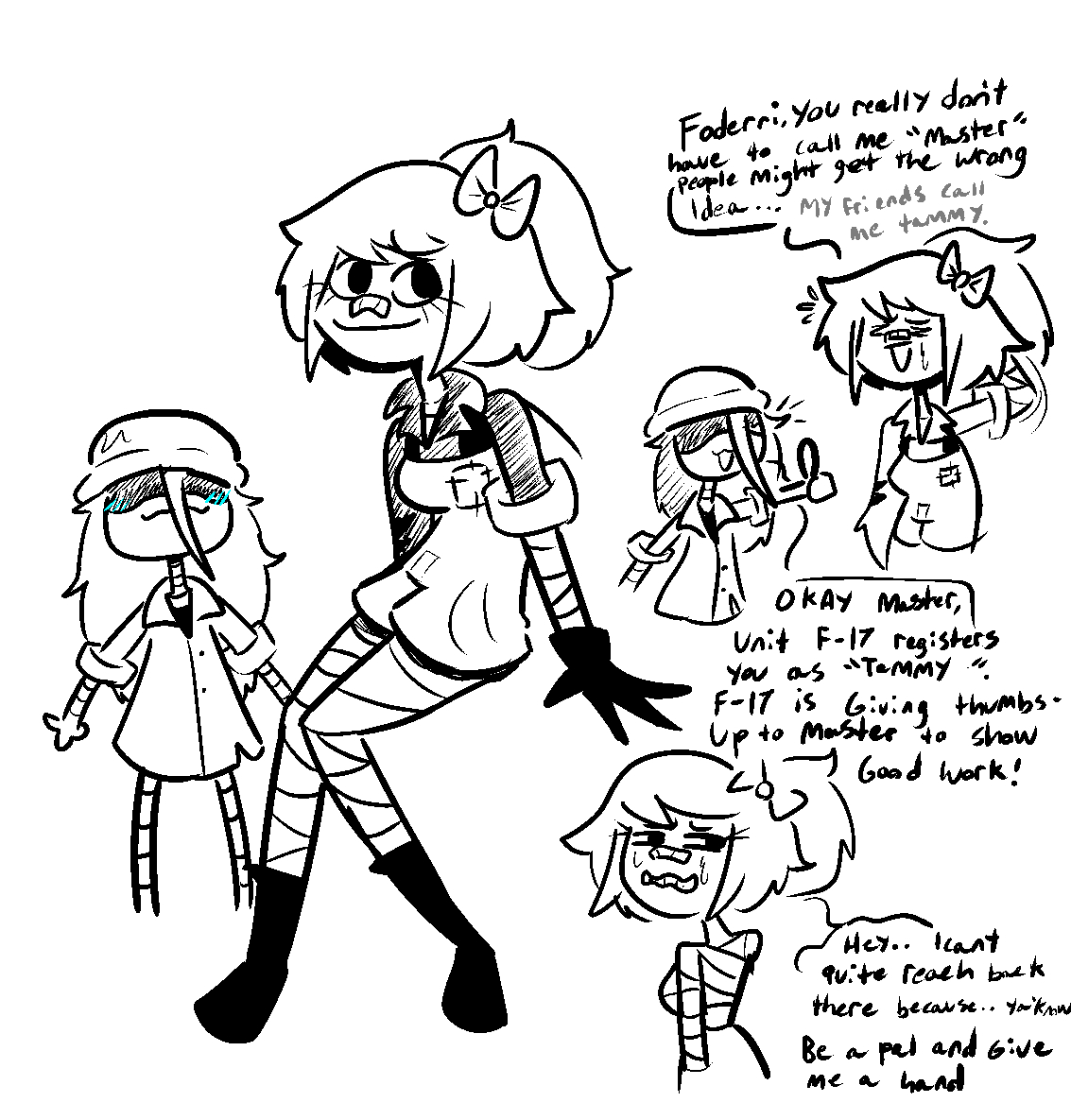 >Tamerie, is the Fodder Drone caretaker. Once a soldier, an incident on the field left her with one less arm and in charge of the Fodder drone program for the camp. In this she is fodder all on her own, the idea being someone needs to be there to make sure they dont go feral and kill everyone. >She has taken a liking to Fodderi in particular, even cutting her own hair to make her drone wig and dying it. >Fodderi is currently the longest living Fodder drone to exist, and has taken a liking to Tamerie as well seeing her as a true caring master, despite Tameries constant asking just to be called Tammy