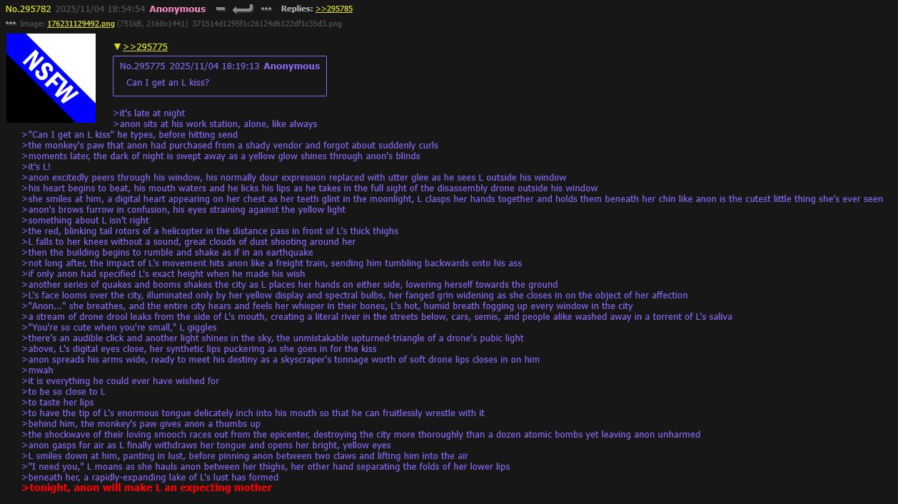 >>295775 >it's late at night >anon sits at his work station, alone, like always >"Can I get an L kiss" he types, before hitting send >the monkey's paw that anon had purchased from a shady vendor and forgot about suddenly curls >moments later, the dark of night is swept away as a yellow glow shines through anon's blinds >it's L! >anon excitedly peers through his window, his normally dour expression replaced with utter glee as he sees L outside his window >his heart begins to beat, his mouth waters and he licks his lips as he takes in the full sight of the disassembly drone outside his window >she smiles at him, a digital heart appearing on her chest as her teeth glint in the moonlight, L clasps her hands together and holds them beneath her chin like anon is the cutest little thing she's ever seen >anon's brows furrow in confusion, his eyes straining against the yellow light >something about L isn't right >the red, blinking tail rotors of a helicopter in the distance pass in front of L's thick thighs >L falls to her knees without a sound, great clouds of dust shooting around her >then the building begins to rumble and shake as if in an earthquake >not long after, the impact of L's movement hits anon like a freight train, sending him tumbling backwards onto his ass >if only anon had specified L's exact height when he made his wish >another series of quakes and booms shakes the city as L places her hands on either side, lowering herself towards the ground >L's face looms over the city, illuminated only by her yellow display and spectral bulbs, her fanged grin widening as she closes in on the object of her affection >"Anon..." she breathes, and the entire city hears and feels her whisper in their bones, L's hot, humid breath fogging up every window in the city >a stream of drone drool leaks from the side of L's mouth, creating a literal river in the streets below, cars, semis, and people alike washed away in a torrent of L's saliva >"You're so cute when you're small," L giggles >there's an audible click and another light shines in the sky, the unmistakable upturned-triangle of a drone's pubic light >above, L's digital eyes close, her synthetic lips puckering as she goes in for the kiss >anon spreads his arms wide, ready to meet his destiny as a skyscraper's tonnage worth of soft drone lips closes in on him >mwah >it is everything he could ever have wished for >to be so close to L >to taste her lips >to have the tip of L's enormous tongue delicately inch into his mouth so that he can fruitlessly wrestle with it >behind him, the monkey's paw gives anon a thumbs up >the shockwave of their loving smooch races out from the epicenter, destroying the city more thoroughly than a dozen atomic bombs yet leaving anon unharmed >anon gasps for air as L finally withdraws her tongue and opens her bright, yellow eyes >L smiles down at him, panting in lust, before pinning anon between two claws and lifting him into the air >"I need you," L moans as she hauls anon between her thighs, her other hand separating the folds of her lower lips >beneath her, a rapidly-expanding lake of L's lust has formed >tonight, anon will make L an expecting mother