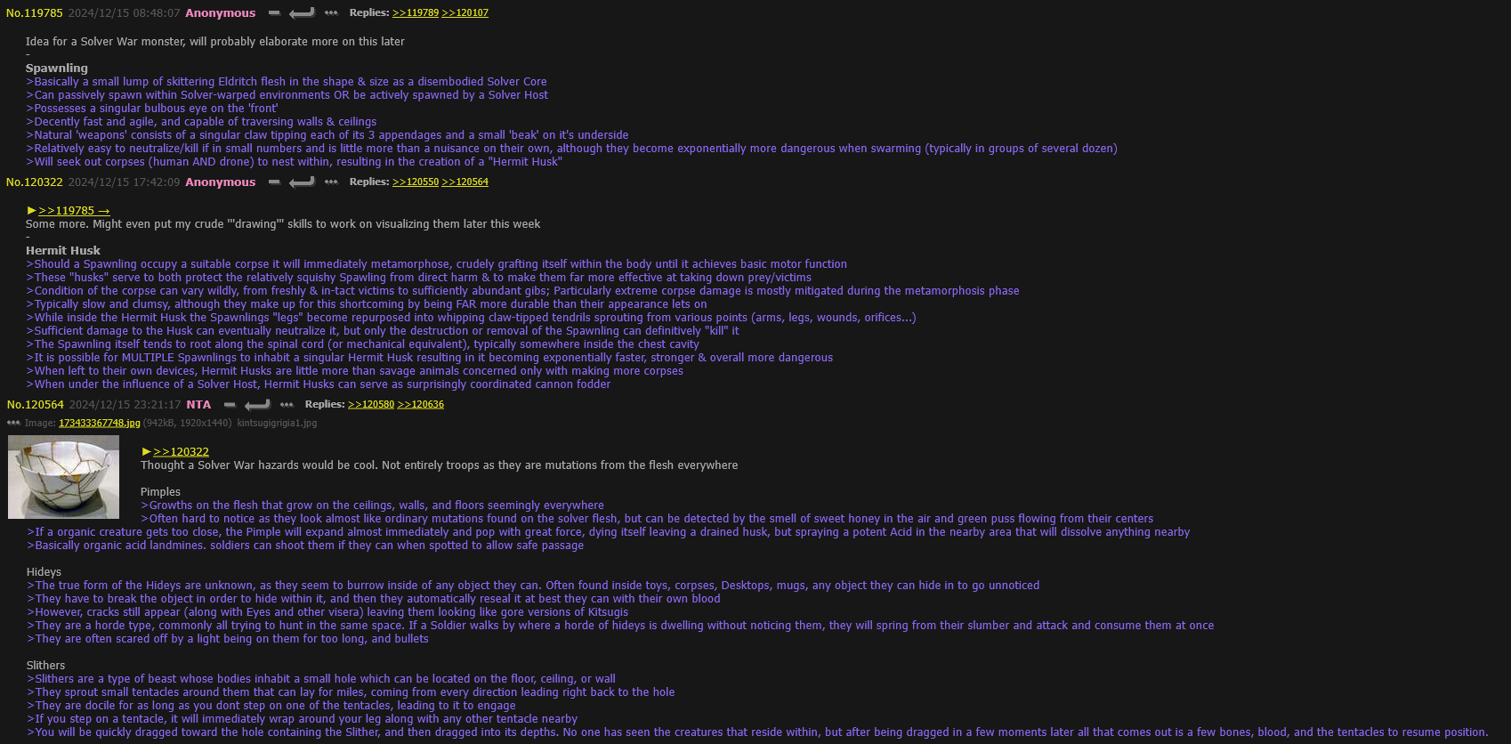 Let me put an example for drones. >Illness/infections made by solver related hosts (Like infected oil, meat stuff they can make out of the solver power) >Solverpedes fucking up areas and making them whole flesh hive areas, abominable horrors >DD with special flesh bits with very specific functions. Let's not forget Uzi is the main host, and she could make horrors out of her understanding without her knowing (Cyn tail)