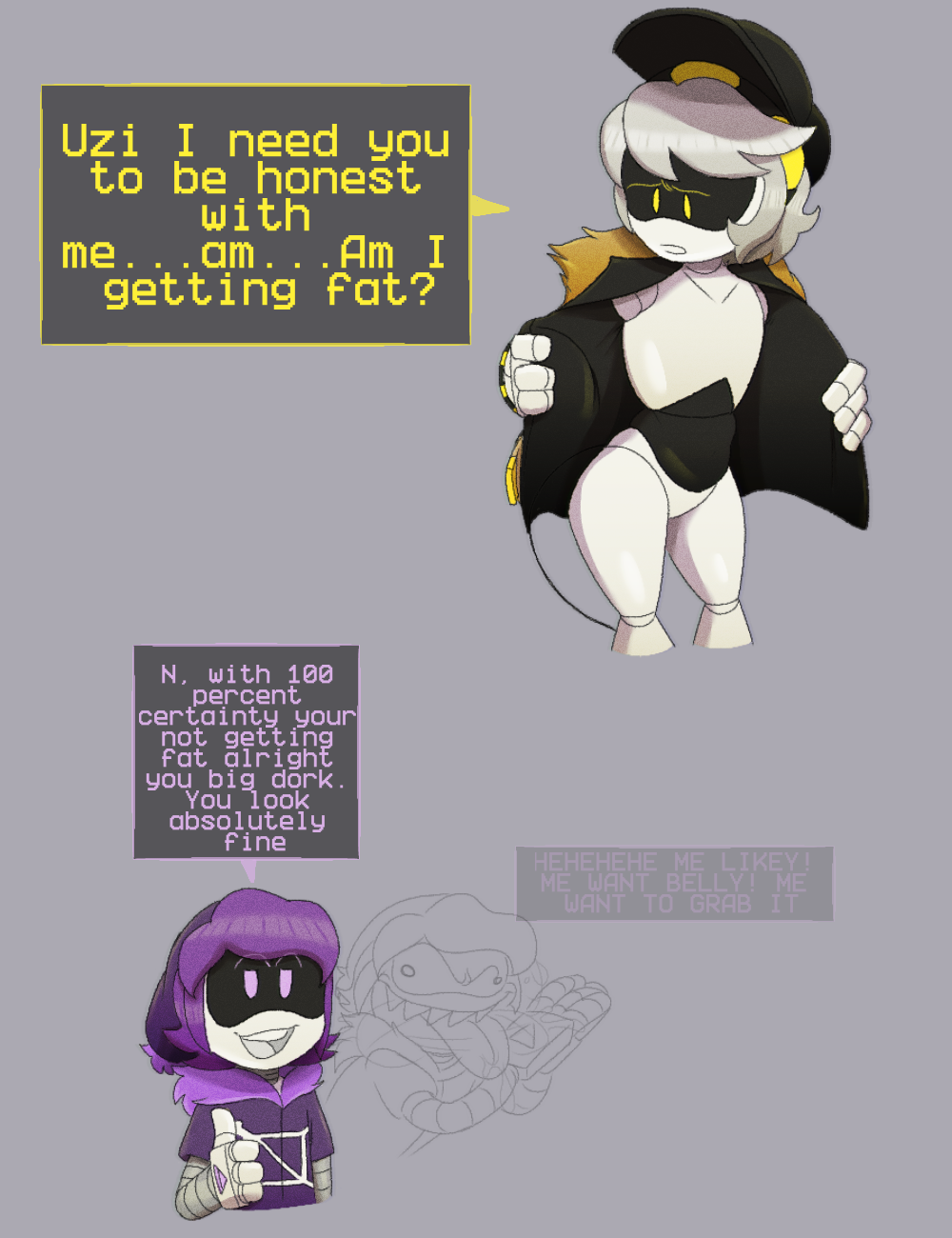 >>296502 >try to help J up >forget that she is industrial machinery and weighs a literal ton >there is now another splat where anon's head was and J's fat rear currently is >J cries because she needs to beg Uzi to revive anon again and the gremlin will make fun of her
