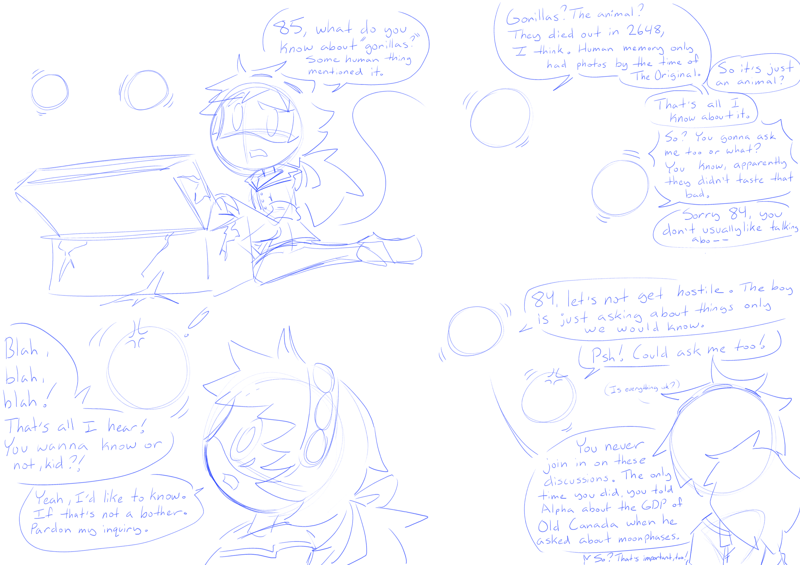 >Alpha frowned. Ugh, even the other pair of the ship were concerned about him to this degree. He’d get a relief when 84 said, “ugh, really? My own sibling saying that stuff? Let the boy do his own thing”