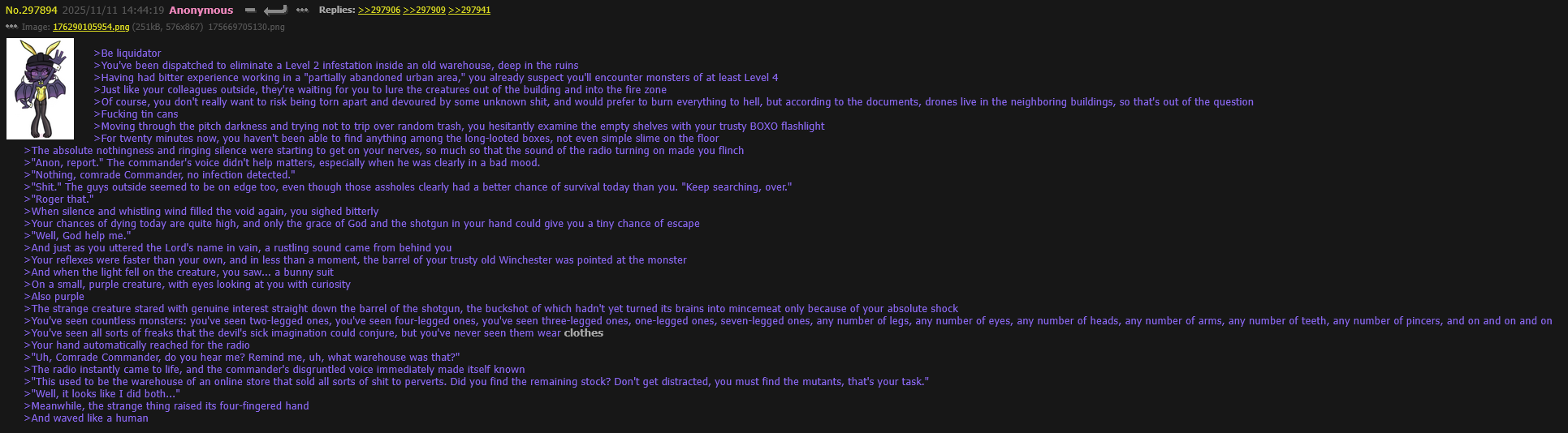 >Be liquidator >You've been dispatched to eliminate a Level 2 infestation inside an old warehouse, deep in the ruins >Having had bitter experience working in a "partially abandoned urban area," you already suspect you'll encounter monsters of at least Level 4 >Just like your colleagues outside, they're waiting for you to lure the creatures out of the building and into the fire zone >Of course, you don't really want to risk being torn apart and devoured by some unknown shit, and would prefer to burn everything to hell, but according to the documents, drones live in the neighboring buildings, so that's out of the question >Fucking tin cans >Moving through the pitch darkness and trying not to trip over random trash, you hesitantly examine the empty shelves with your trusty BOXO flashlight >For twenty minutes now, you haven't been able to find anything among the long-looted boxes, not even simple slime on the floor >The absolute nothingness and ringing silence were starting to get on your nerves, so much so that the sound of the radio turning on made you flinch >"Anon, report." The commander's voice didn't help matters, especially when he was clearly in a bad mood. >"Nothing, comrade Commander, no infection detected." >"Shit." The guys outside seemed to be on edge too, even though those assholes clearly had a better chance of survival today than you. "Keep searching, over." >"Roger that." >When silence and whistling wind filled the void again, you sighed bitterly >Your chances of dying today are quite high, and only the grace of God and the shotgun in your hand could give you a tiny chance of escape >"Well, God help me." >And just as you uttered the Lord's name in vain, a rustling sound came from behind you >Your reflexes were faster than your own, and in less than a moment, the barrel of your trusty old Winchester was pointed at the monster >And when the light fell on the creature, you saw... a bunny suit >On a small, purple creature, with eyes looking at you with curiosity >Also purple >The strange creature stared with genuine interest straight down the barrel of the shotgun, the buckshot of which hadn't yet turned its brains into mincemeat only because of your absolute shock >You've seen countless monsters: you've seen two-legged ones, you've seen four-legged ones, you've seen three-legged ones, one-legged ones, seven-legged ones, any number of legs, any number of eyes, any number of heads, any number of arms, any number of teeth, any number of pincers, and on and on and on >You've seen all sorts of freaks that the devil's sick imagination could conjure, but you've never seen them wear clothes >Your hand automatically reached for the radio >"Uh, Comrade Commander, do you hear me? Remind me, uh, what warehouse was that?" >The radio instantly came to life, and the commander's disgruntled voice immediately made itself known >"This used to be the warehouse of an online store that sold all sorts of shit to perverts. Did you find the remaining stock? Don't get distracted, you must find the mutants, that's your task." >"Well, it looks like I did both..." >Meanwhile, the strange thing raised its four-fingered hand >And waved like a human
