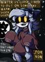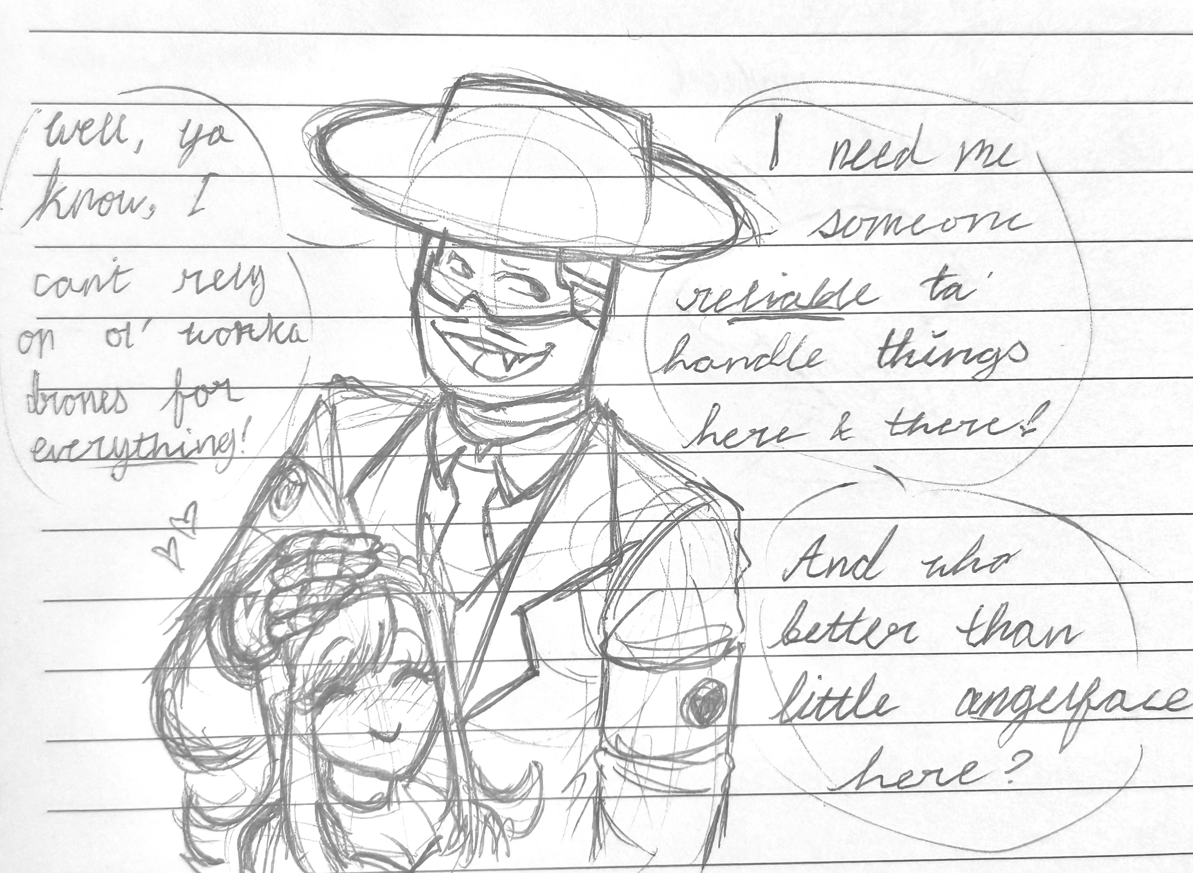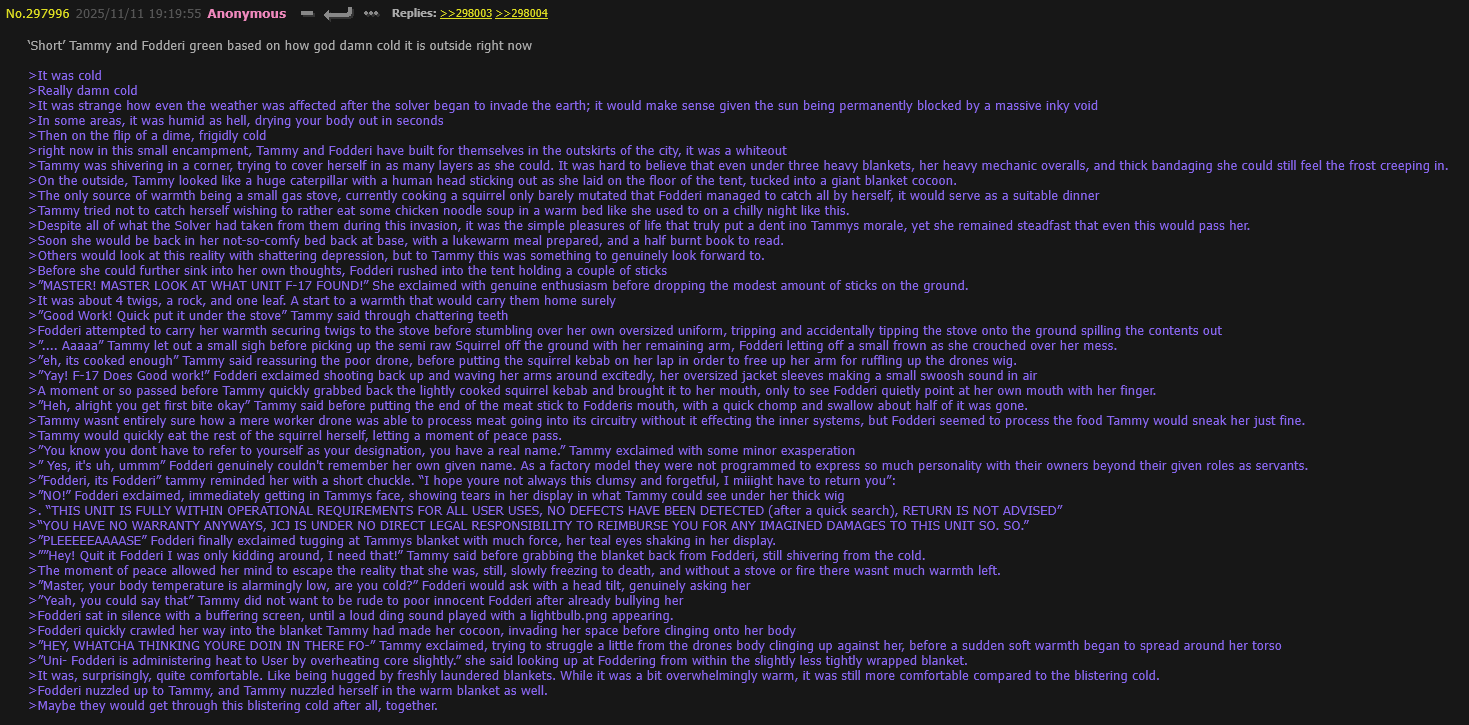 >It was cold >Really damn cold >It was strange how even the weather was affected after the solver began to invade the earth; it would make sense given the sun being permanently blocked by a massive inky void >In some areas, it was humid as hell, drying your body out in seconds >Then on the flip of a dime, frigidly cold >right now in this small encampment, Tammy and Fodderi have built for themselves in the outskirts of the city, it was a whiteout >Tammy was shivering in a corner, trying to cover herself in as many layers as she could. It was hard to believe that even under three heavy blankets, her heavy mechanic overalls, and thick bandaging she could still feel the frost creeping in. >On the outside, Tammy looked like a huge caterpillar with a human head sticking out as she laid on the floor of the tent, tucked into a giant blanket cocoon. >The only source of warmth being a small gas stove, currently cooking a squirrel only barely mutated that Fodderi managed to catch all by herself, it would serve as a suitable dinner >Tammy tried not to catch herself wishing to rather eat some chicken noodle soup in a warm bed like she used to on a chilly night like this. >Despite all of what the Solver had taken from them during this invasion, it was the simple pleasures of life that truly put a dent ino Tammys morale, yet she remained steadfast that even this would pass her. >Soon she would be back in her not-so-comfy bed back at base, with a lukewarm meal prepared, and a half burnt book to read. >Others would look at this reality with shattering depression, but to Tammy this was something to genuinely look forward to. >Before she could further sink into her own thoughts, Fodderi rushed into the tent holding a couple of sticks >”MASTER! MASTER LOOK AT WHAT UNIT F-17 FOUND!” She exclaimed with genuine enthusiasm before dropping the modest amount of sticks on the ground. >It was about 4 twigs, a rock, and one leaf. A start to a warmth that would carry them home surely >”Good Work! Quick put it under the stove” Tammy said through chattering teeth >Fodderi attempted to carry her warmth securing twigs to the stove before stumbling over her own oversized uniform, tripping and accidentally tipping the stove onto the ground spilling the contents out >”.... Aaaaa” Tammy let out a small sigh before picking up the semi raw Squirrel off the ground with her remaining arm, Fodderi letting off a small frown as she crouched over her mess. >”eh, its cooked enough” Tammy said reassuring the poor drone, before putting the squirrel kebab on her lap in order to free up her arm for ruffling up the drones wig. >”Yay! F-17 Does Good work!” Fodderi exclaimed shooting back up and waving her arms around excitedly, her oversized jacket sleeves making a small swoosh sound in air >A moment or so passed before Tammy quickly grabbed back the lightly cooked squirrel kebab and brought it to her mouth, only to see Fodderi quietly point at her own mouth with her finger. >”Heh, alright you get first bite okay” Tammy said before putting the end of the meat stick to Fodderis mouth, with a quick chomp and swallow about half of it was gone. >Tammy wasnt entirely sure how a mere worker drone was able to process meat going into its circuitry without it effecting the inner systems, but Fodderi seemed to process the food Tammy would sneak her just fine. >Tammy would quickly eat the rest of the squirrel herself, letting a moment of peace pass. >”You know you dont have to refer to yourself as your designation, you have a real name.” Tammy exclaimed with some minor exasperation >” Yes, it's uh, ummm” Fodderi genuinely couldn't remember her own given name. As a factory model they were not programmed to express so much personality with their owners beyond their given roles as servants. >”Fodderi, its Fodderi” tammy reminded her with a short chuckle. “I hope youre not always this clumsy and forgetful, I miiight have to return you”: >”NO!” Fodderi exclaimed, immediately getting in Tammys face, showing tears in her display in what Tammy could see under her thick wig >. “THIS UNIT IS FULLY WITHIN OPERATIONAL REQUIREMENTS FOR ALL USER USES, NO DEFECTS HAVE BEEN DETECTED (after a quick search), RETURN IS NOT ADVISED” >“YOU HAVE NO WARRANTY ANYWAYS, JCJ IS UNDER NO DIRECT LEGAL RESPONSIBILITY TO REIMBURSE YOU FOR ANY IMAGINED DAMAGES TO THIS UNIT SO. SO.” >”PLEEEEEAAAASE” Fodderi finally exclaimed tugging at Tammys blanket with much force, her teal eyes shaking in her display. >””Hey! Quit it Fodderi I was only kidding around, I need that!” Tammy said before grabbing the blanket back from Fodderi, still shivering from the cold. >The moment of peace allowed her mind to escape the reality that she was, still, slowly freezing to death, and without a stove or fire there wasnt much warmth left. >”Master, your body temperature is alarmingly low, are you cold?” Fodderi would ask with a head tilt, genuinely asking her >”Yeah, you could say that” Tammy did not want to be rude to poor innocent Fodderi after already bullying her >Fodderi sat in silence with a buffering screen, until a loud ding sound played with a lightbulb.png appearing. >Fodderi quickly crawled her way into the blanket Tammy had made her cocoon, invading her space before clinging onto her body >”HEY, WHATCHA THINKING YOURE DOIN IN THERE FO-” Tammy exclaimed, trying to struggle a little from the drones body clinging up against her, before a sudden soft warmth began to spread around her torso >”Uni- Fodderi is administering heat to User by overheating core slightly.” she said looking up at Foddering from within the slightly less tightly wrapped blanket. >It was, surprisingly, quite comfortable. Like being hugged by freshly laundered blankets. While it was a bit overwhelmingly warm, it was still more comfortable compared to the blistering cold. >Fodderi nuzzled up to Tammy, and Tammy nuzzled herself in the warm blanket as w