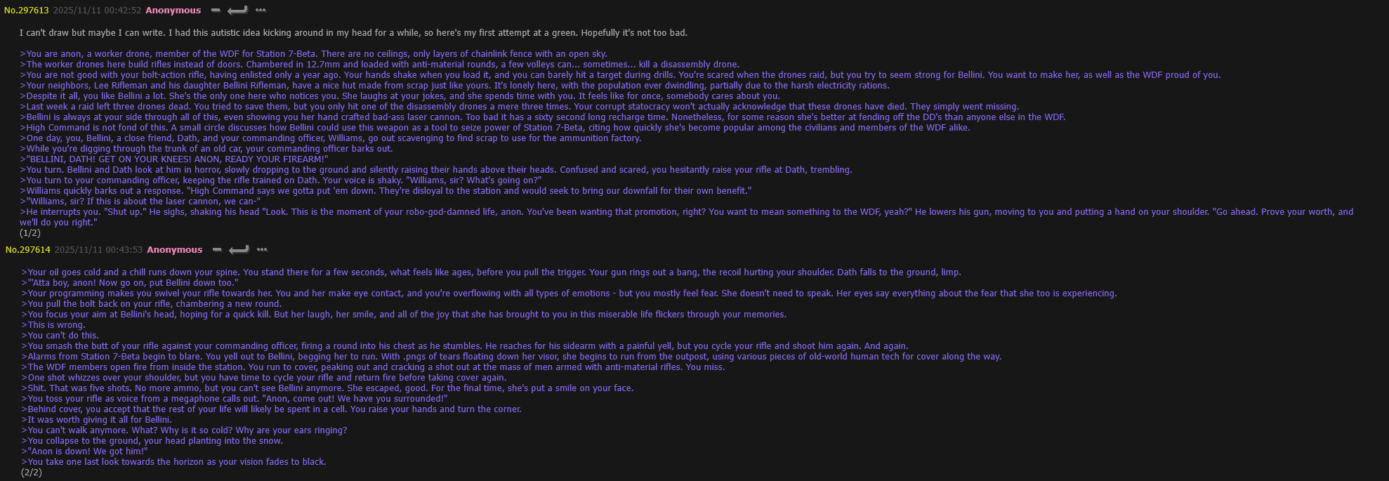 >You are anon, a worker drone, member of the WDF for Station 7-Beta. There are no ceilings, only layers of chainlink fence with an open sky. >The worker drones here build rifles instead of doors. Chambered in 12.7mm and loaded with anti-material rounds, a few volleys can... sometimes... kill a disassembly drone. >You are not good with your bolt-action rifle, having enlisted only a year ago. Your hands shake when you load it, and you can barely hit a target during drills. You're scared when the drones raid, but you try to seem strong for Bellini. You want to make her, as well as the WDF proud of you. >Your neighbors, Lee Rifleman and his daughter Bellini Rifleman, have a nice hut made from scrap just like yours. It's lonely here, with the population ever dwindling, partially due to the harsh electricity rations. >Despite it all, you like Bellini a lot. She's the only one here who notices you. She laughs at your jokes, and she spends time with you. It feels like for once, somebody cares about you. >Last week a raid left three drones dead. You tried to save them, but you only hit one of the disassembly drones a mere three times. Your corrupt statocracy won't actually acknowledge that these drones have died. They simply went missing. >Bellini is always at your side through all of this, even showing you her hand crafted bad-ass laser cannon. Too bad it has a sixty second long recharge time. Nonetheless, for some reason she's better at fending off the DD's than anyone else in the WDF. >High Command is not fond of this. A small circle discusses how Bellini could use this weapon as a tool to seize power of Station 7-Beta, citing how quickly she's become popular among the civilians and members of the WDF alike. >One day, you, Bellini, a close friend, Dath, and your commanding officer, Williams, go out scavenging to find scrap to use for the ammunition factory. >While you're digging through the trunk of an old car, your commanding officer barks out. >"BELLINI, DATH! GET ON YOUR KNEES! ANON, READY YOUR FIREARM!" >You turn. Bellini and Dath look at him in horror, slowly dropping to the ground and silently raising their hands above their heads. Confused and scared, you hesitantly raise your rifle at Dath, trembling. >You turn to your commanding officer, keeping the rifle trained on Dath. Your voice is shaky. "Williams, sir? What's going on?" >Williams quickly barks out a response. "High Command says we gotta put 'em down. They're disloyal to the station and would seek to bring our downfall for their own benefit." >"Williams, sir? If this is about the laser cannon, we can-" >He interrupts you. "Shut up." He sighs, shaking his head "Look. This is the moment of your robo-god-damned life, anon. You've been wanting that promotion, right? You want to mean something to the WDF, yeah?" He lowers his gun, moving to you and putting a hand on your shoulder. "Go ahead. Prove your worth, and we'll do you right." (1/2)