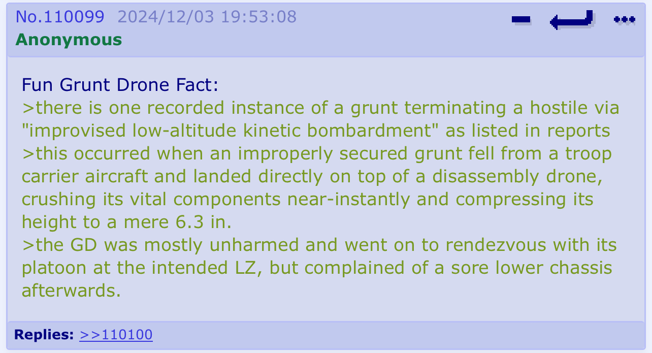 >Grunt drones are immune to uppies, being heavy as hell and not reacting at all if lifted >But they aren't immune to the fastball special >This was done often during the war to "strategically deploy" grunts to advantageous positions, and they'll reflexively curl into a ball if you can pick them up by their wide rear plate with one hand >If you own a grunt drone, try to find an opportunity to rent or buy a power frame, and toss them around a bit, they love it and it's a great bonding exercise